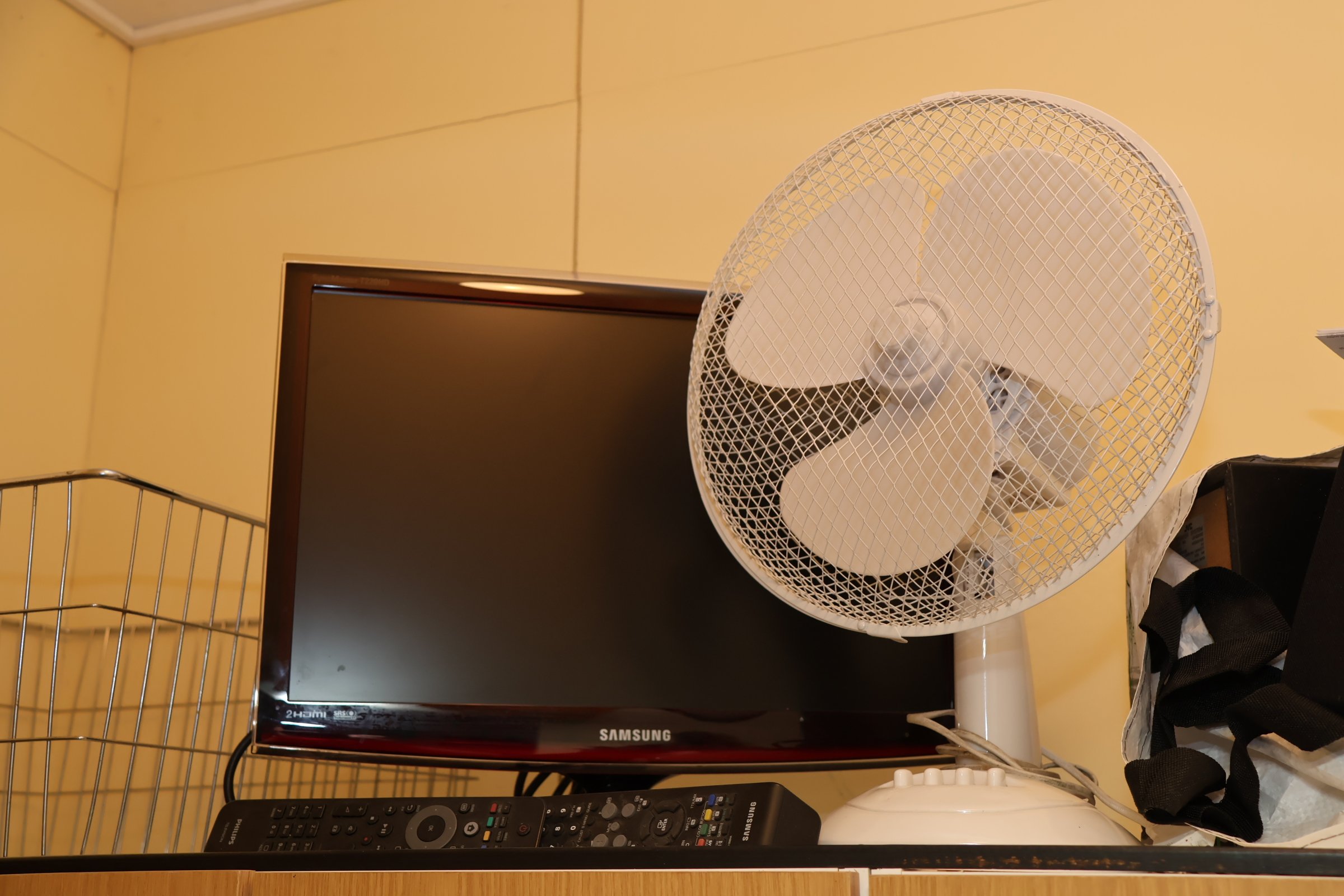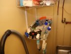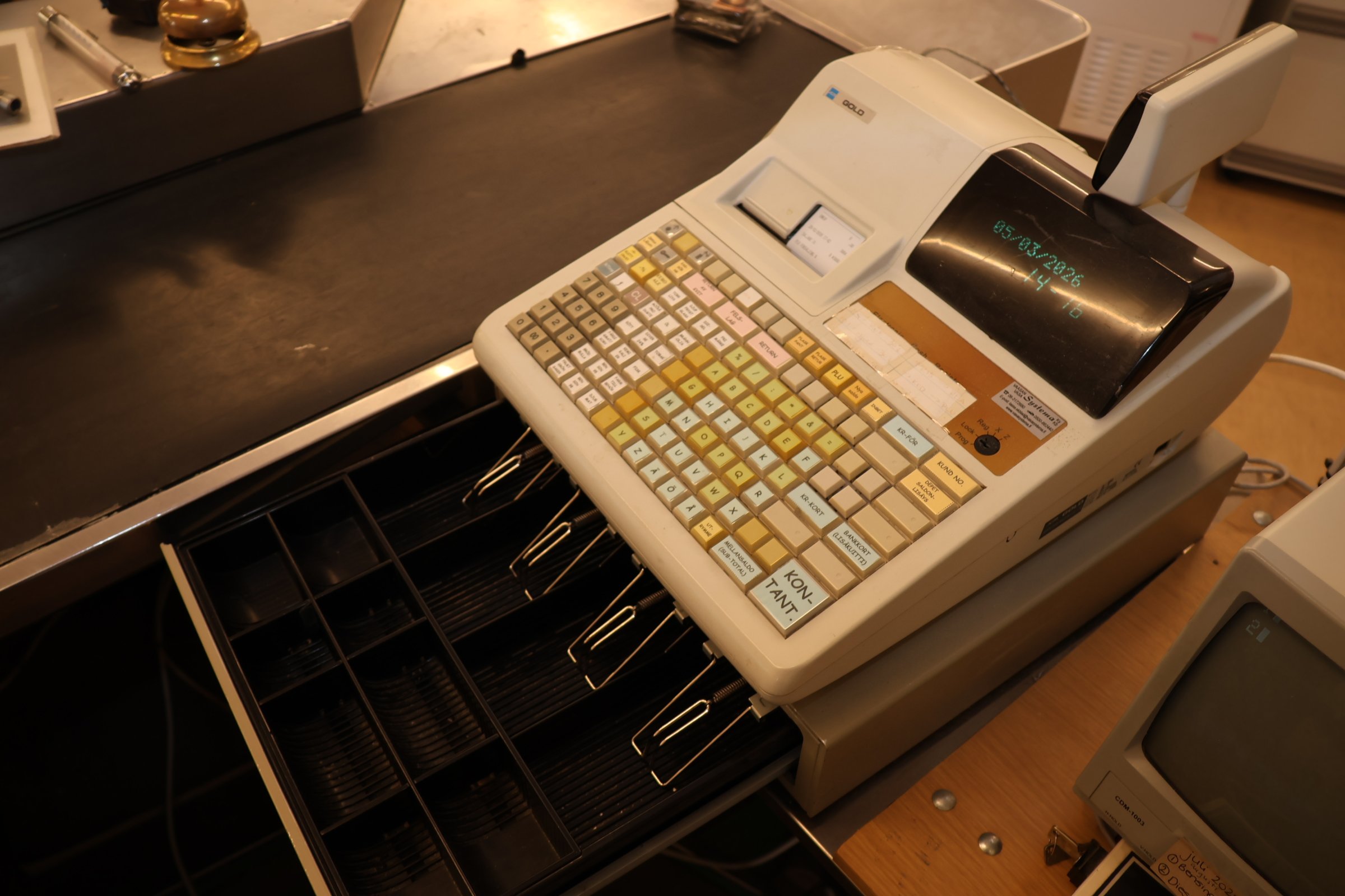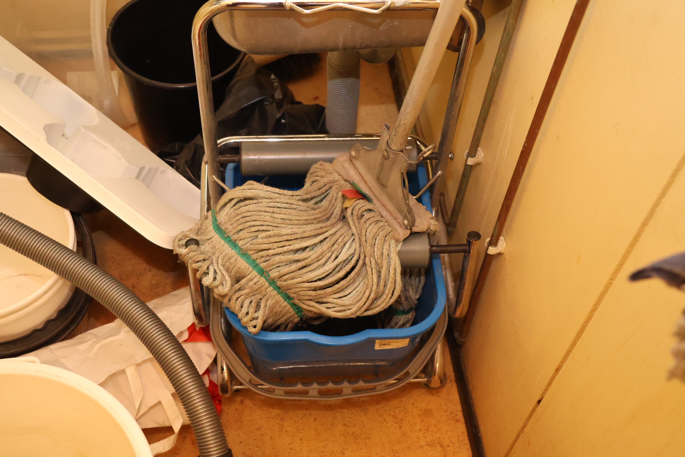 Kassakone, siivoustarvikkeita y.m.