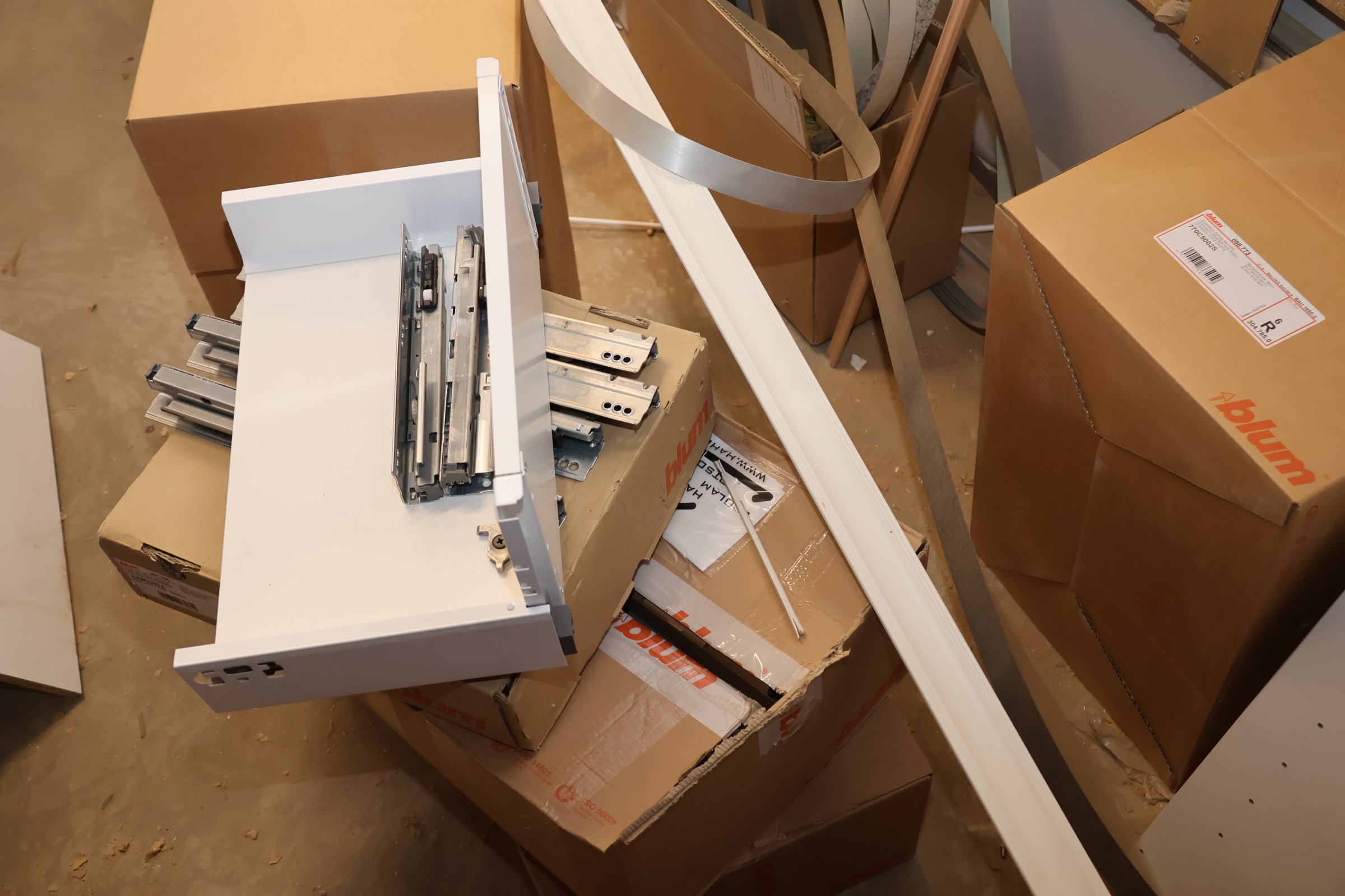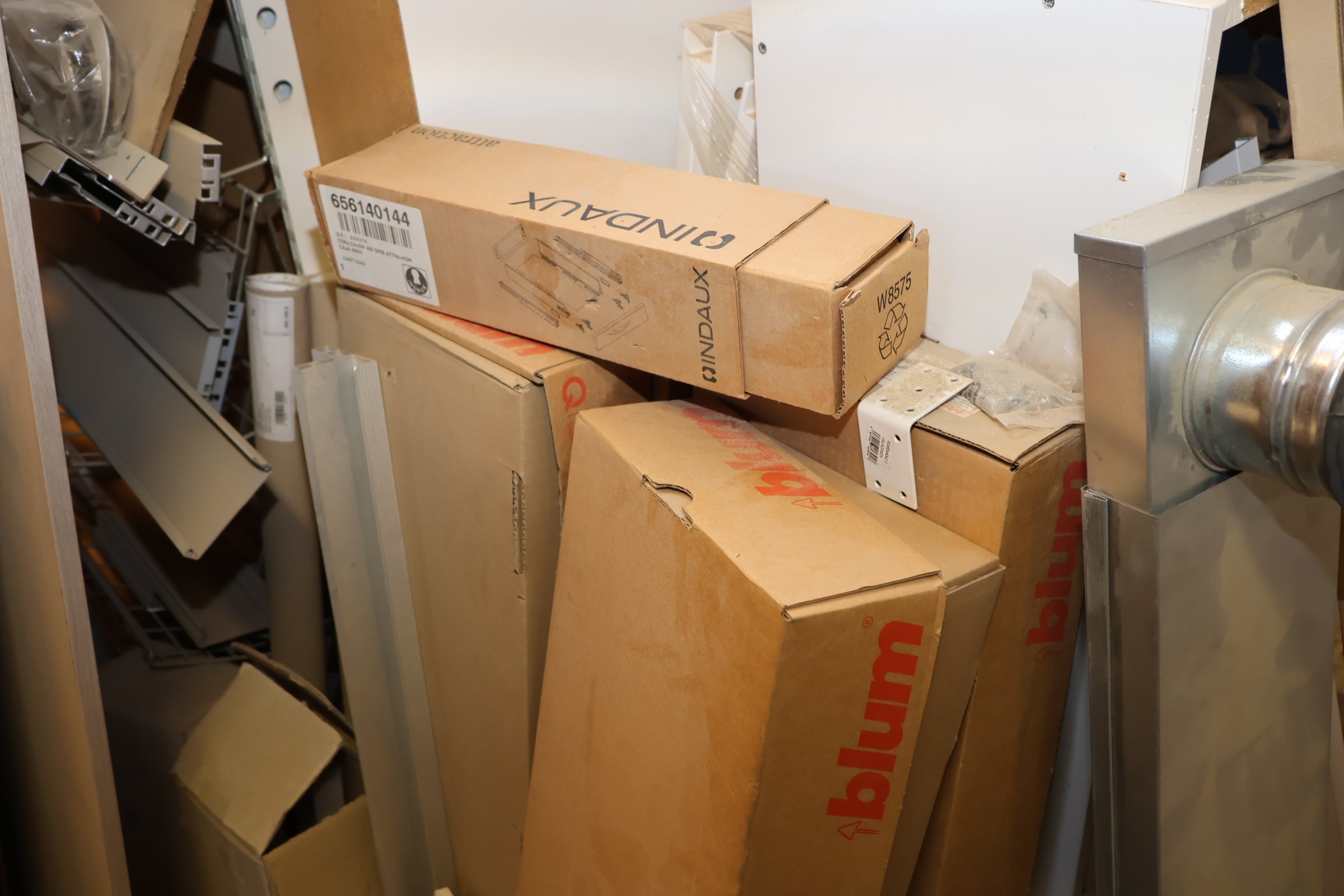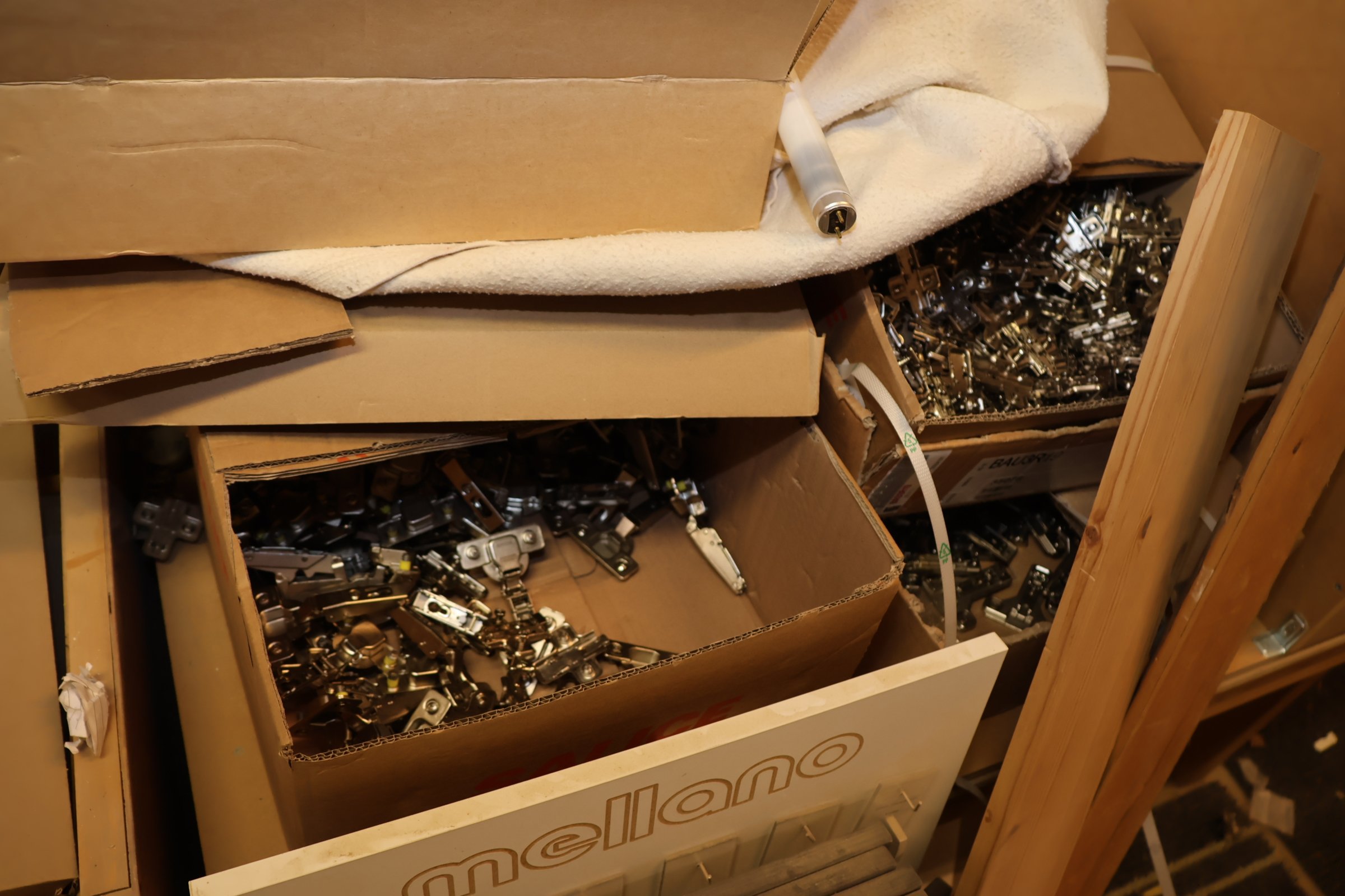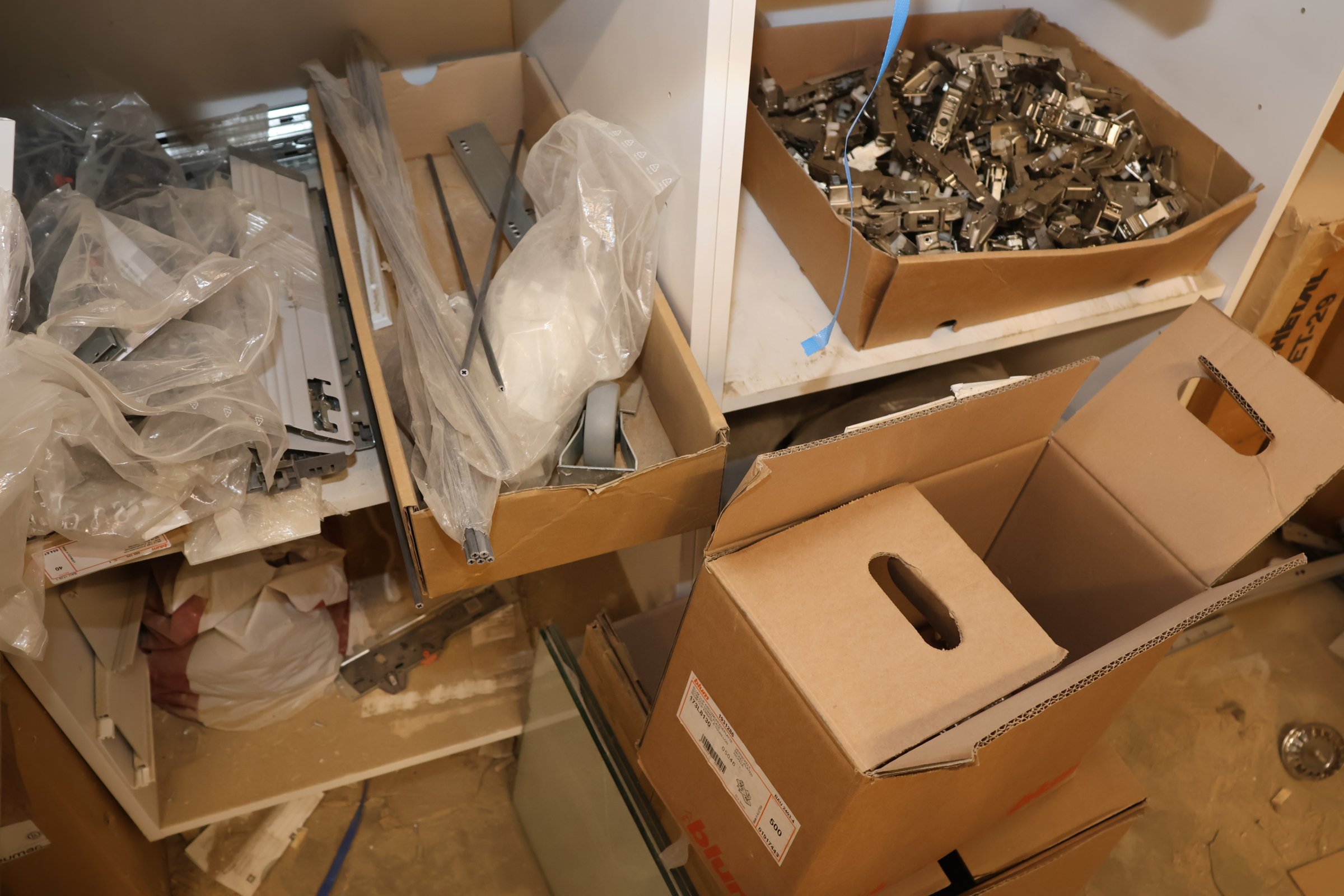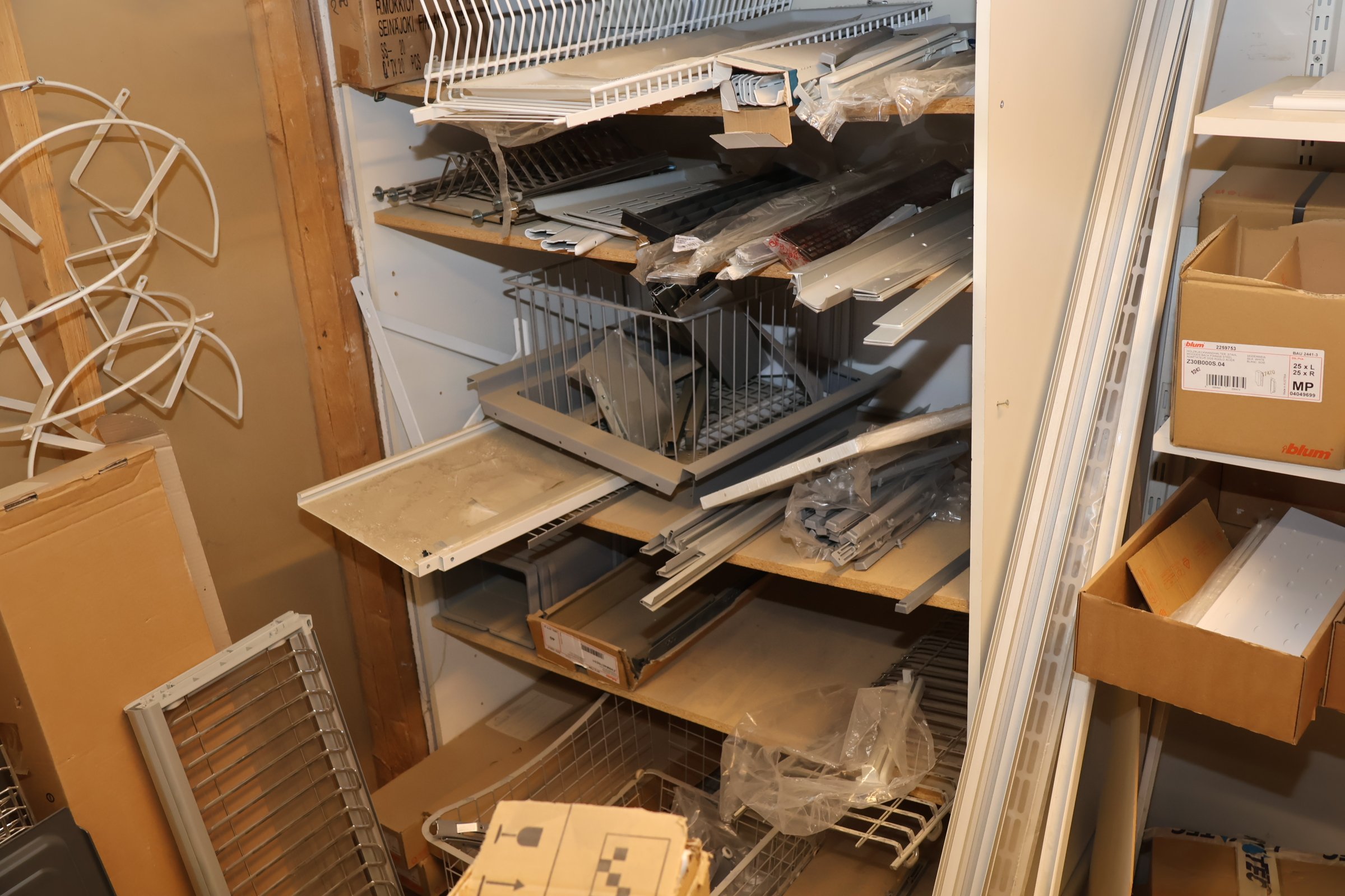 Keittiökaappien saranoita, kiskoja, laatikoita, tarvikkeita y.m.