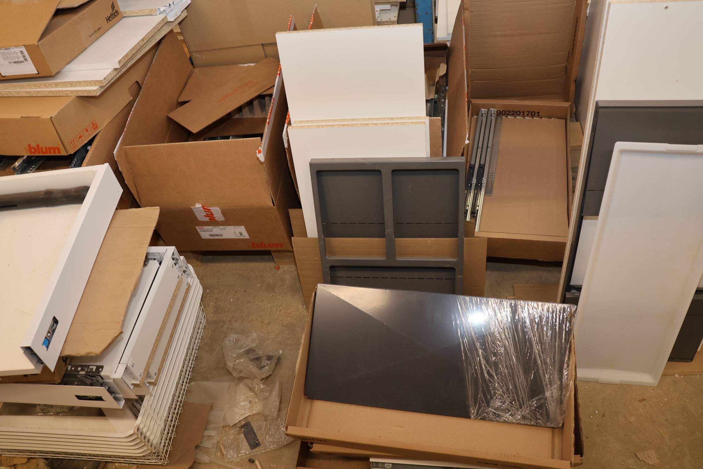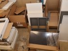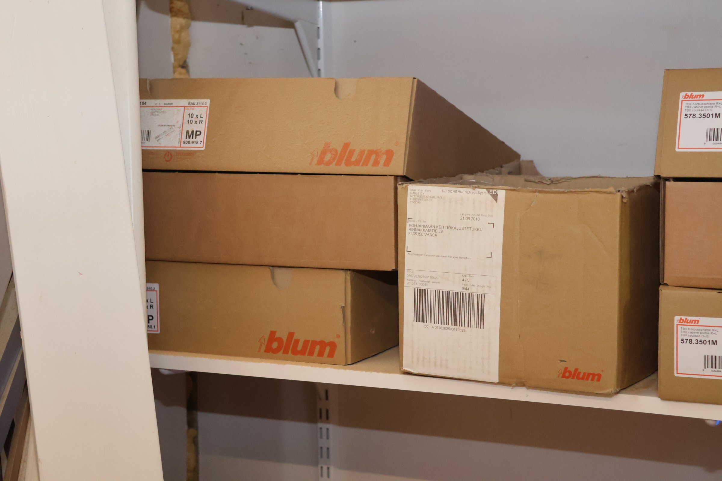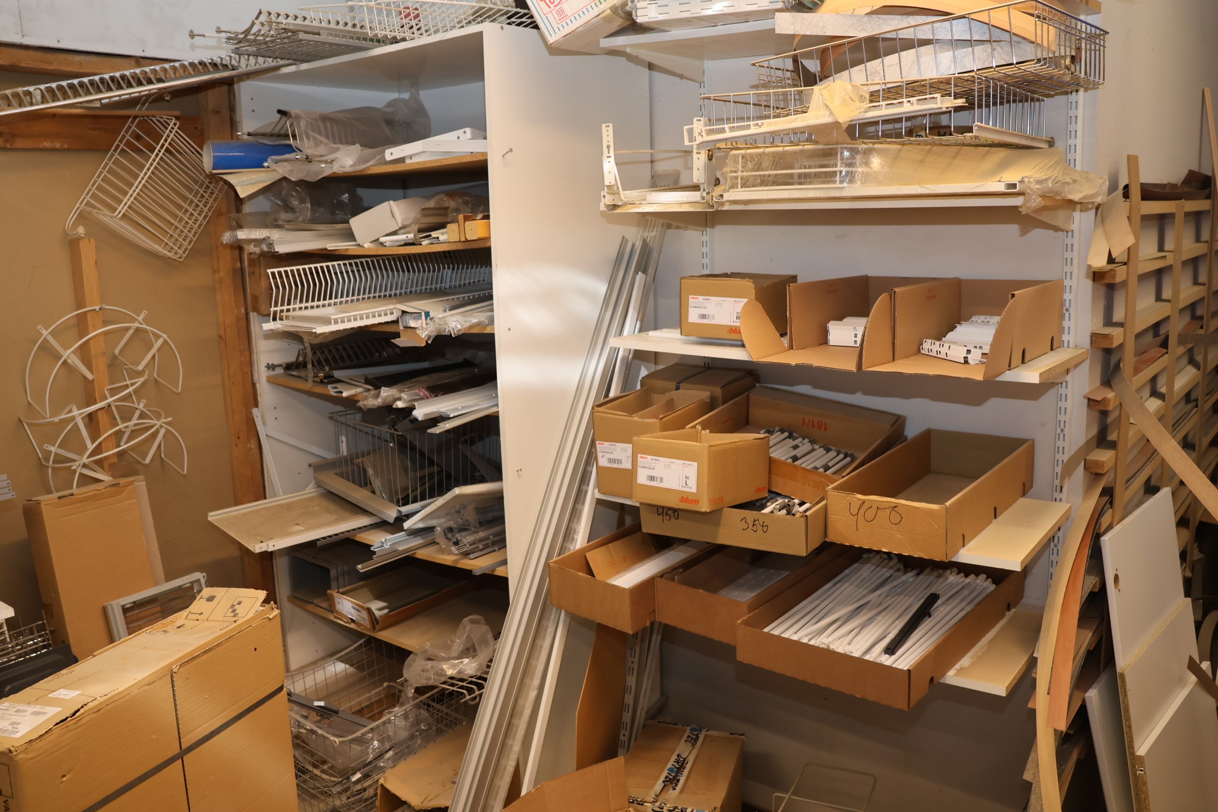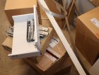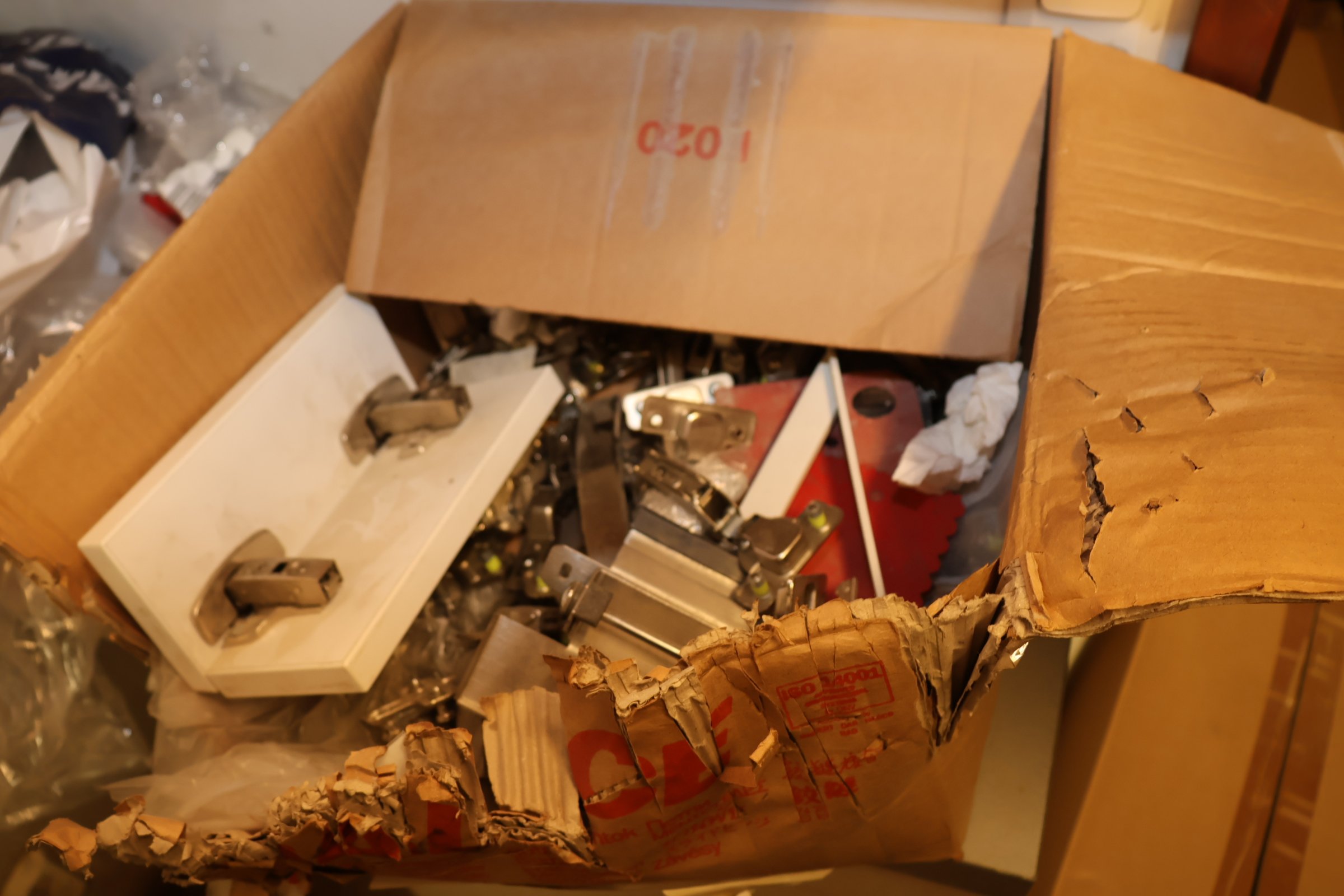 Keittiökaappien saranoita, kiskoja, laatikoita, tarvikkeita y.m.