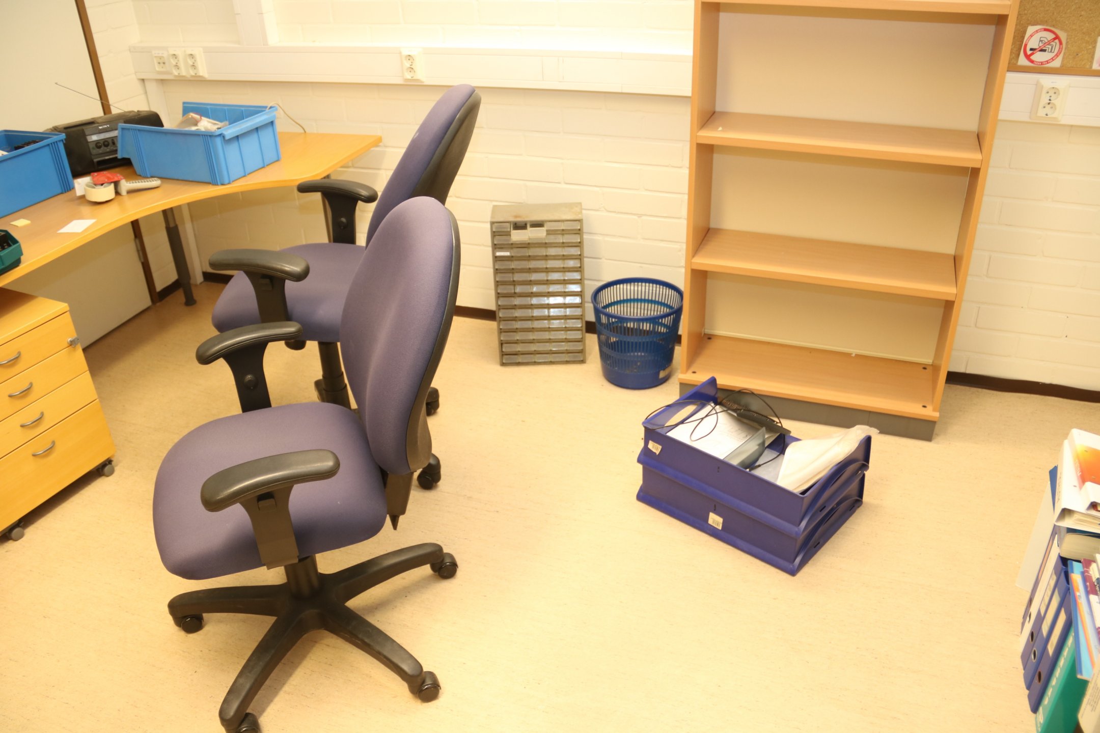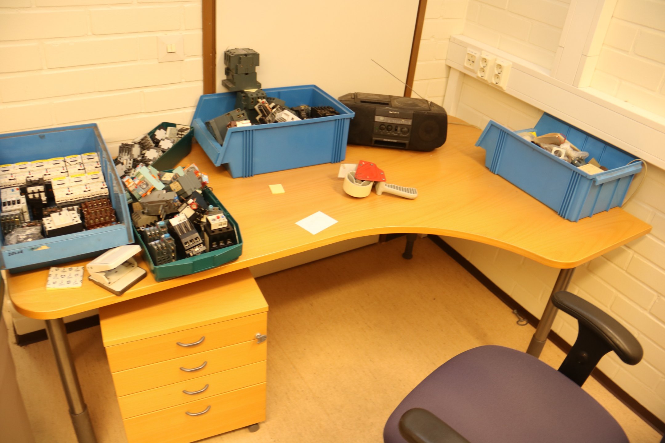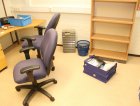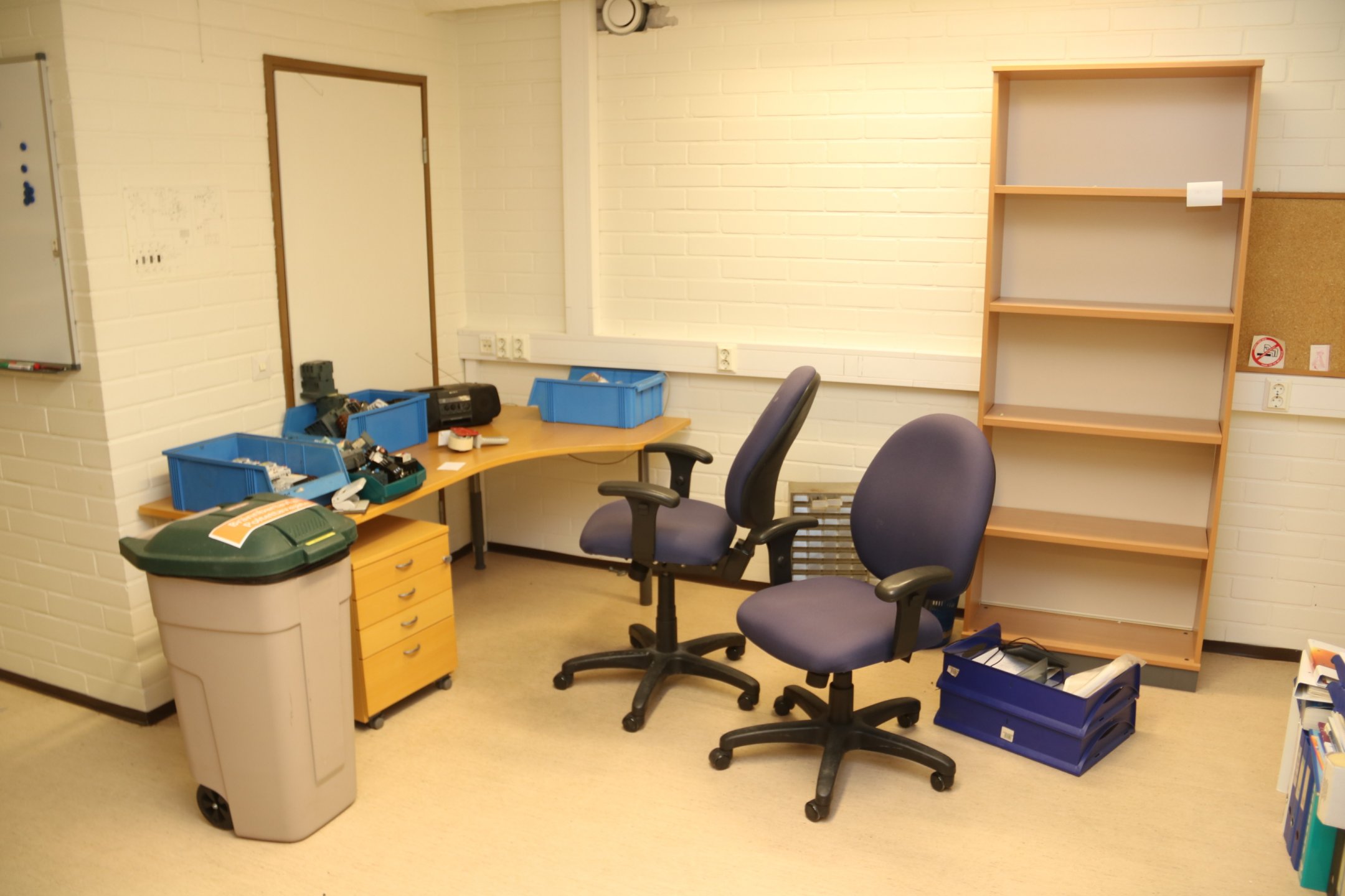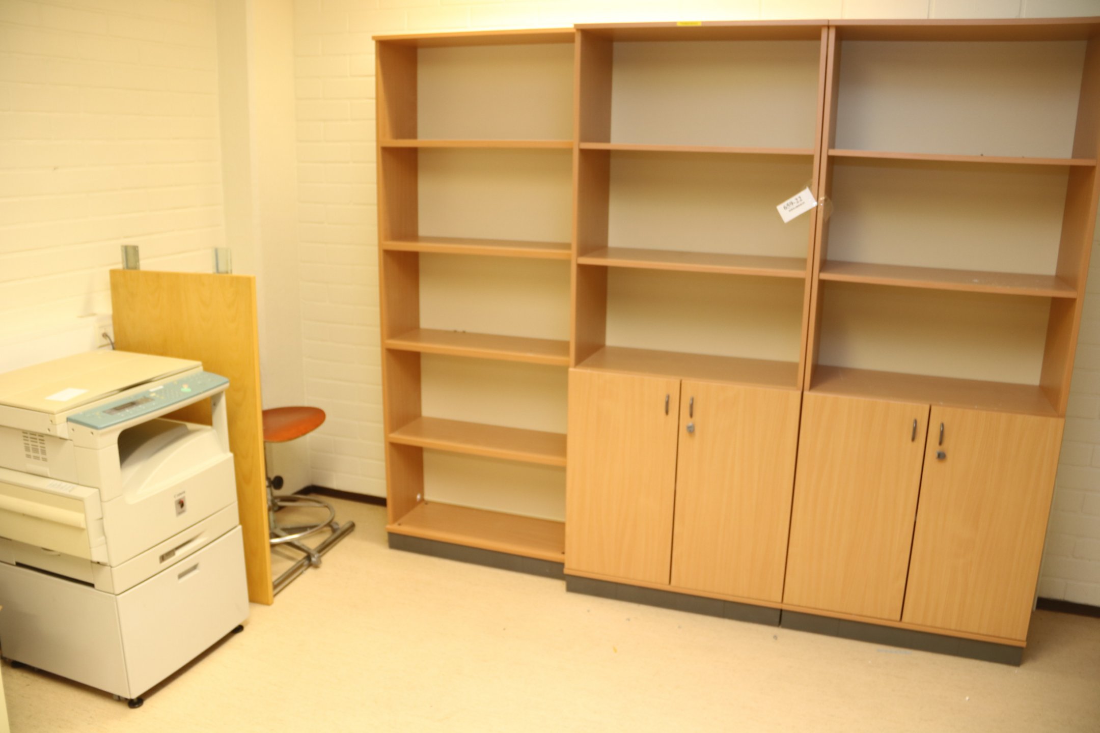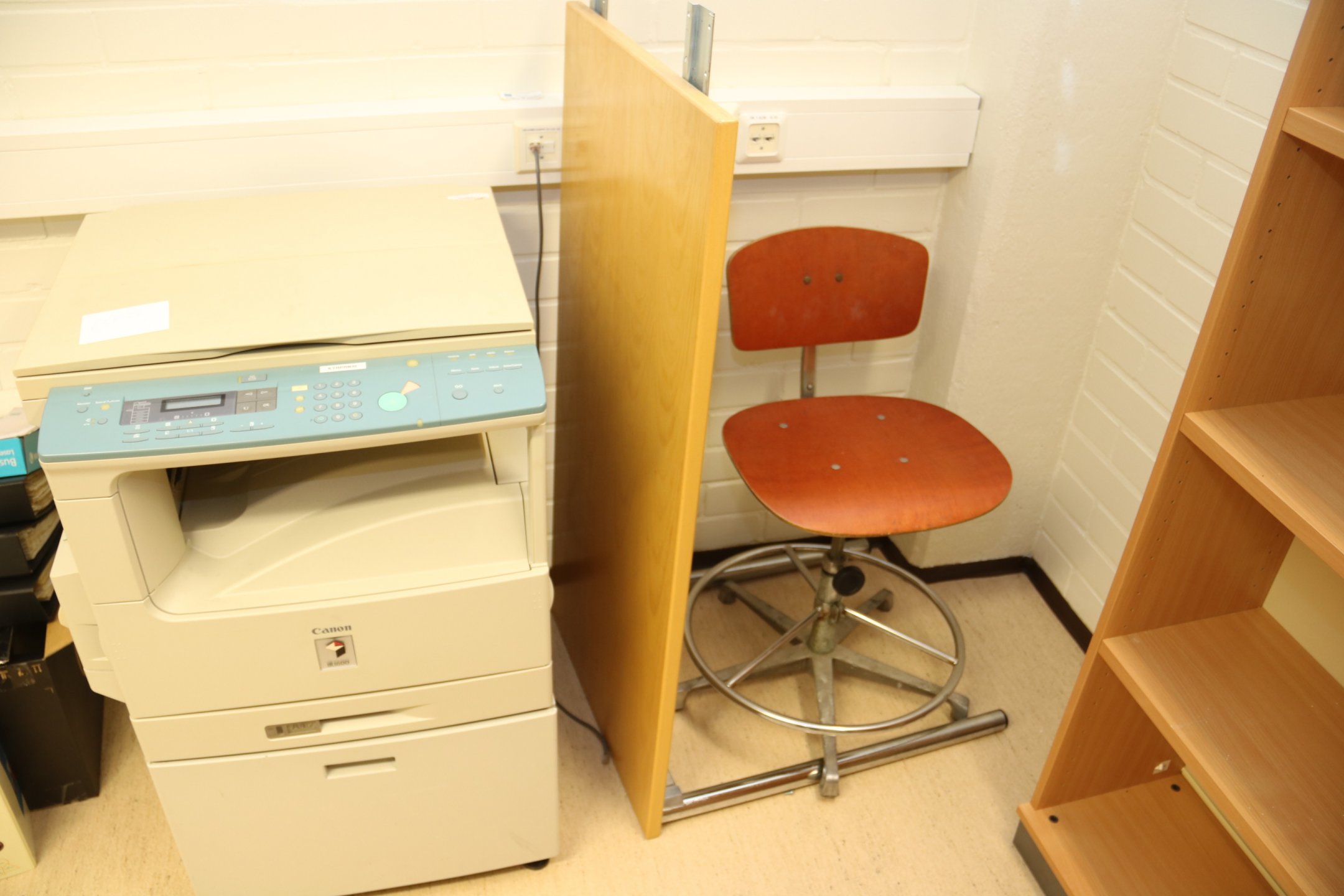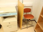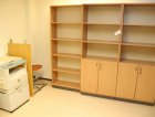 Kirjoituspöytä, hyllyjä, kopiointikone y.m.