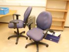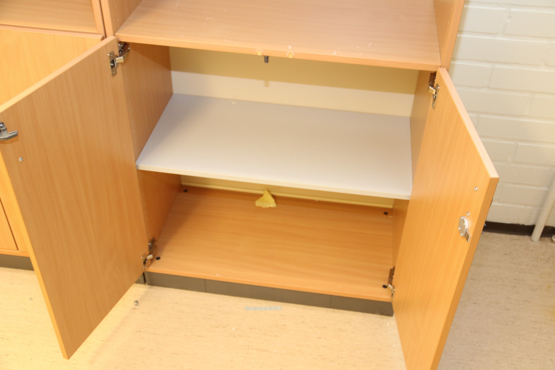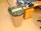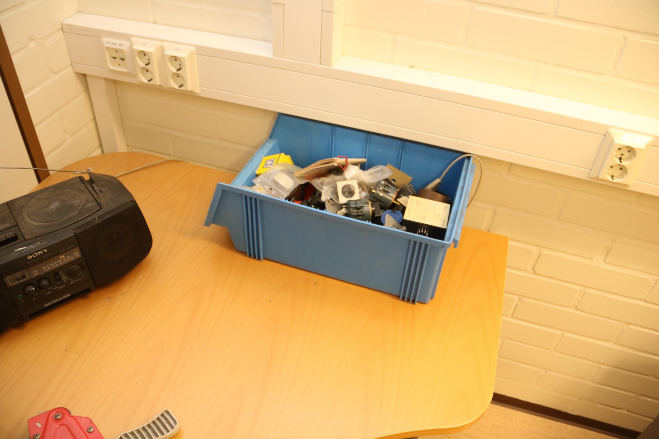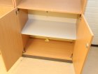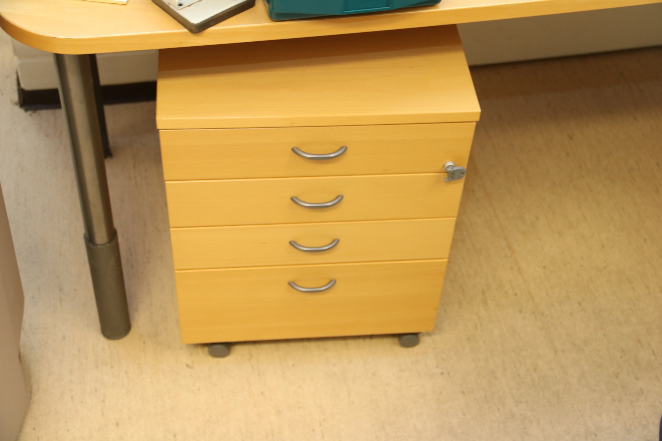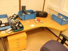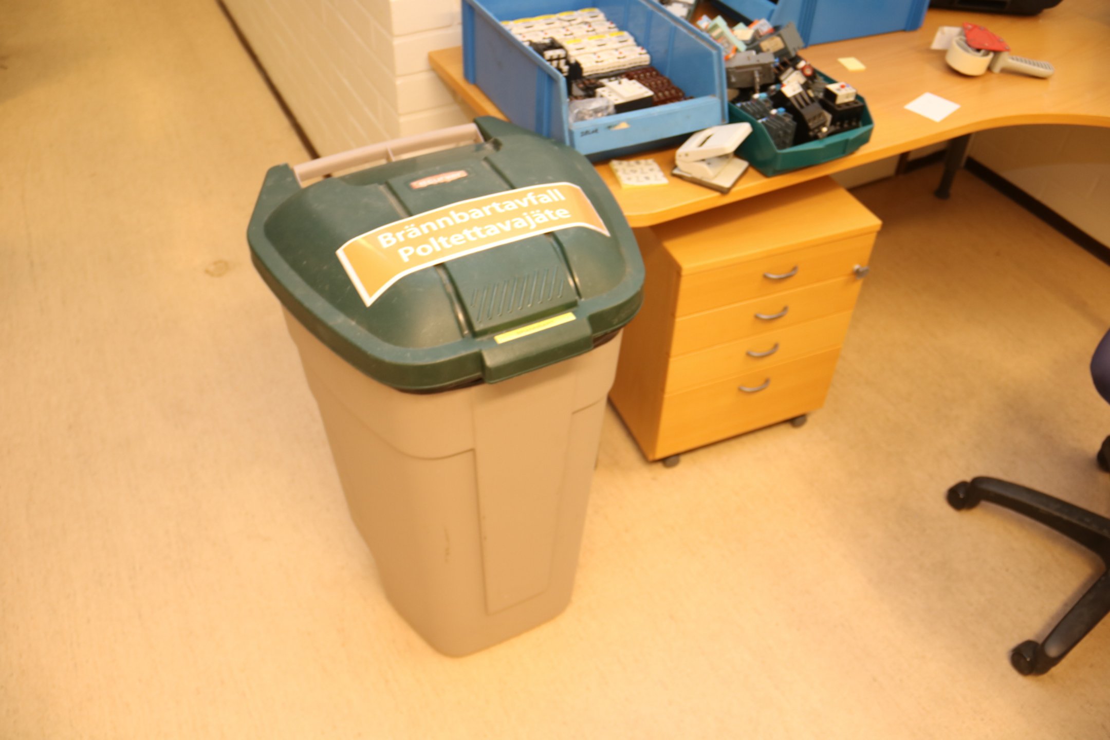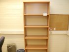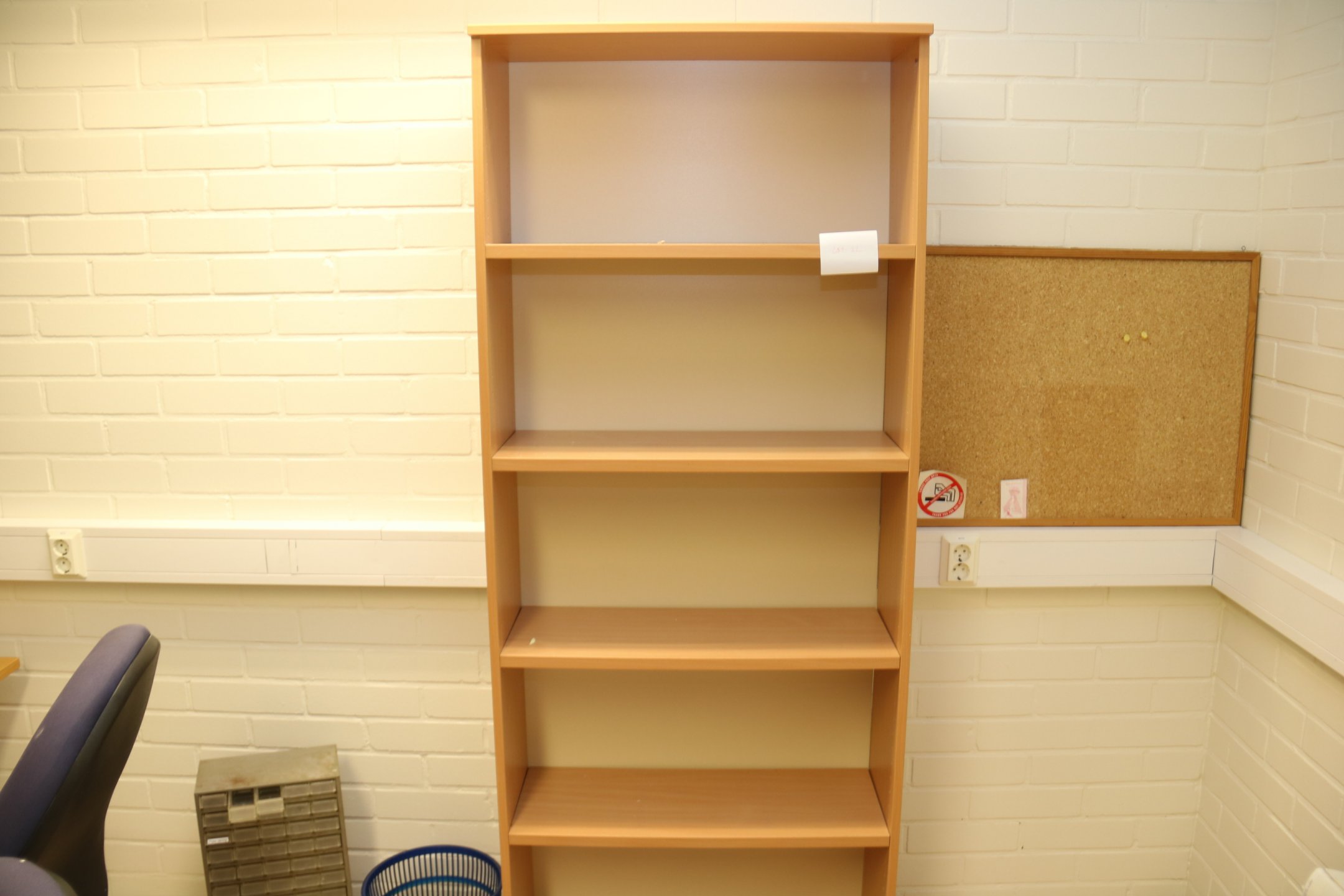 Kirjoituspöytä, hyllyjä, kopiointikone y.m.