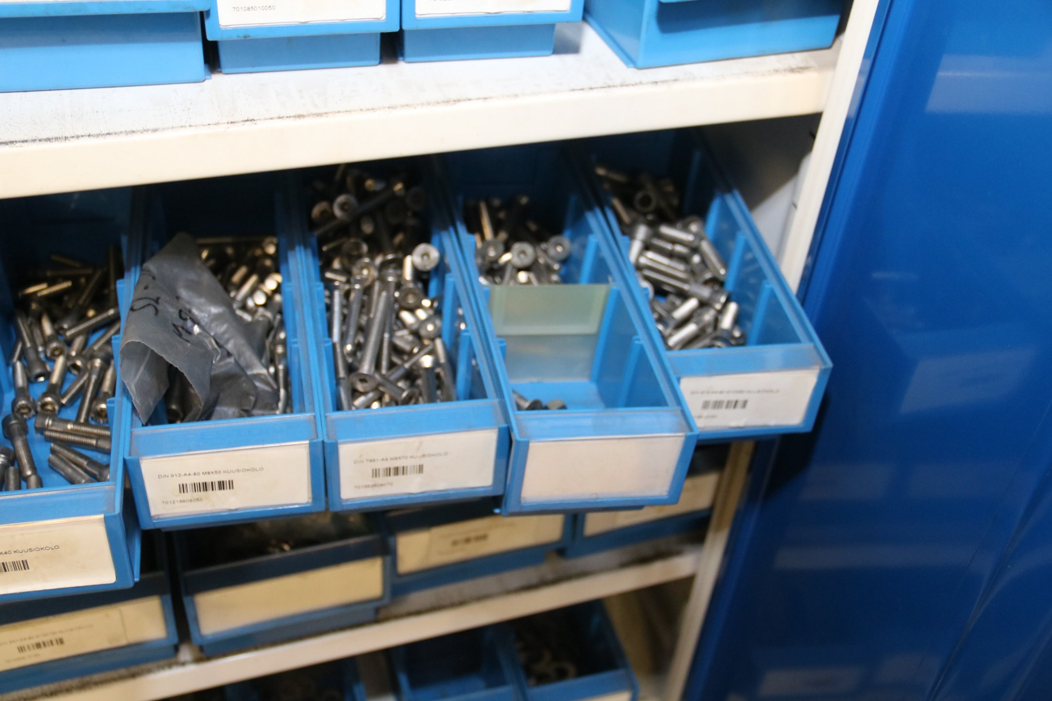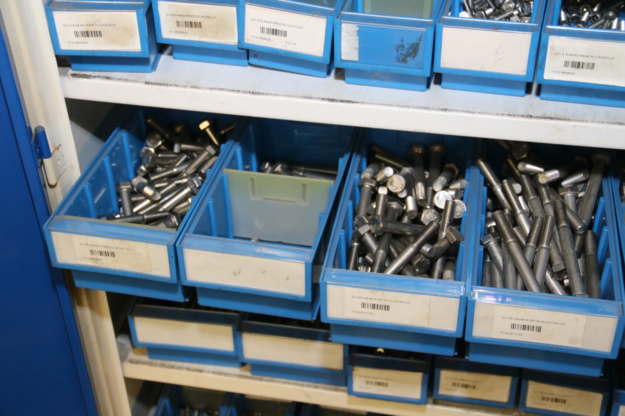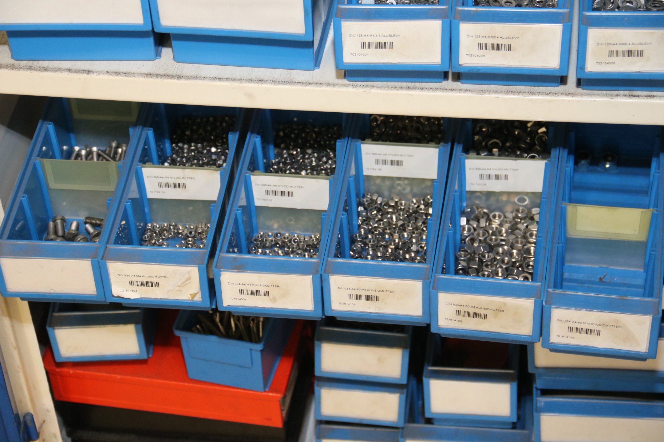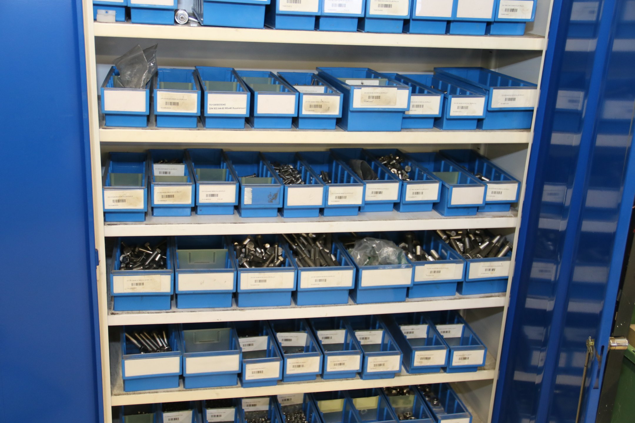 Peltikaappi jossa suurin osa ruostumattomia pultteja, ruuveja y.m.
