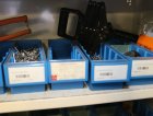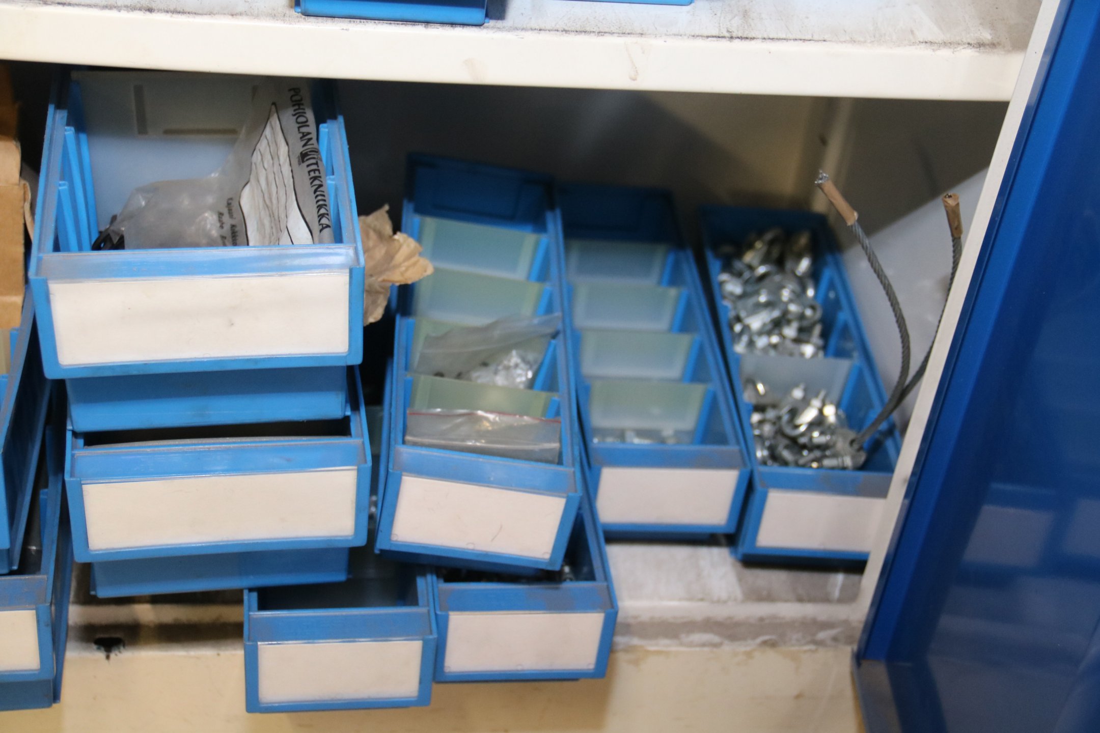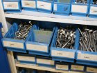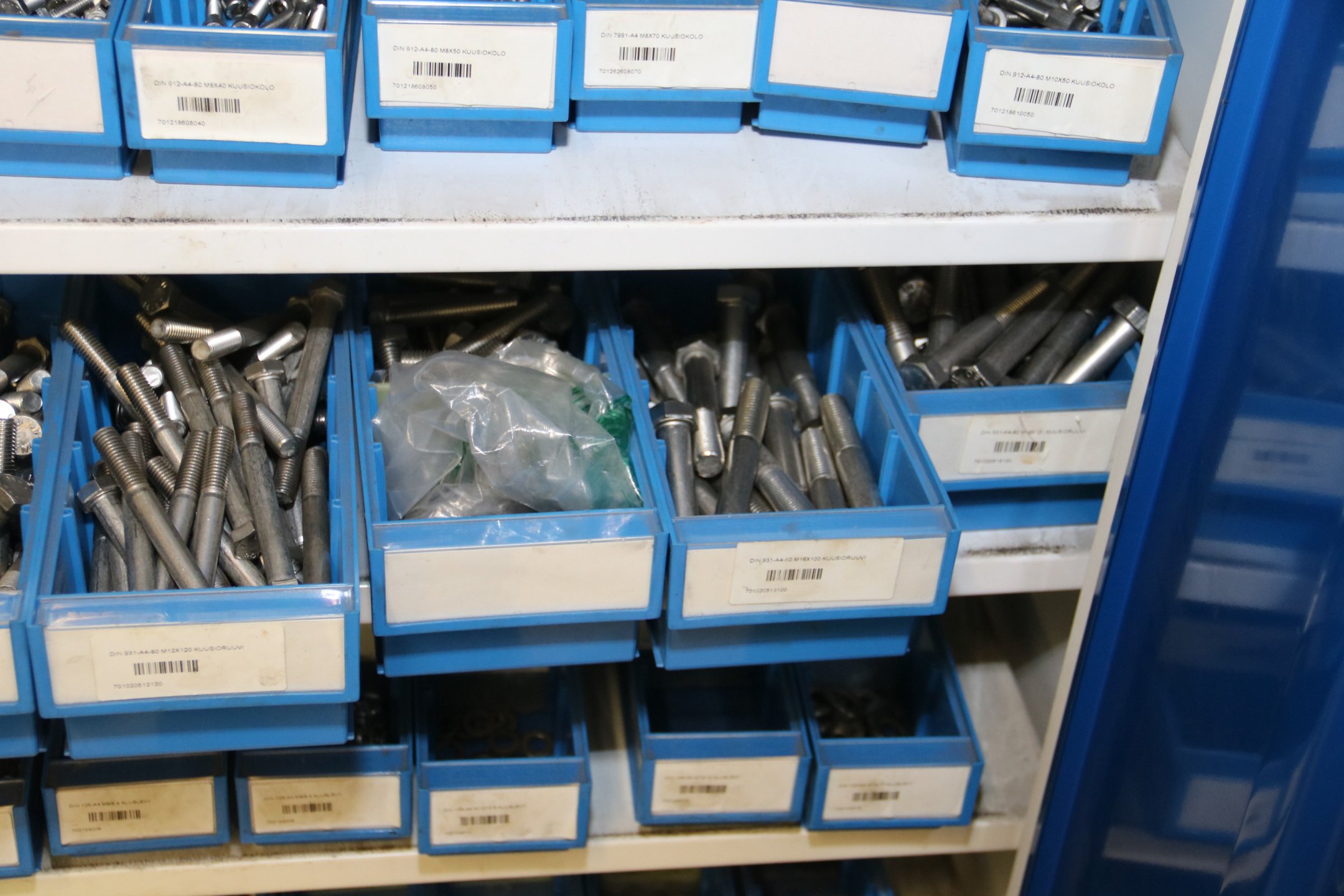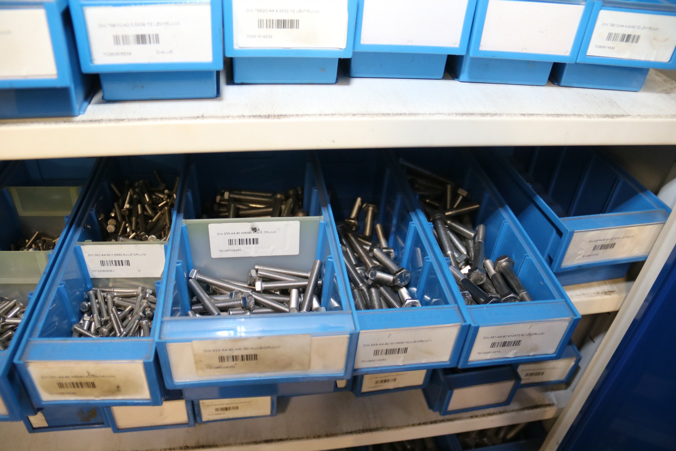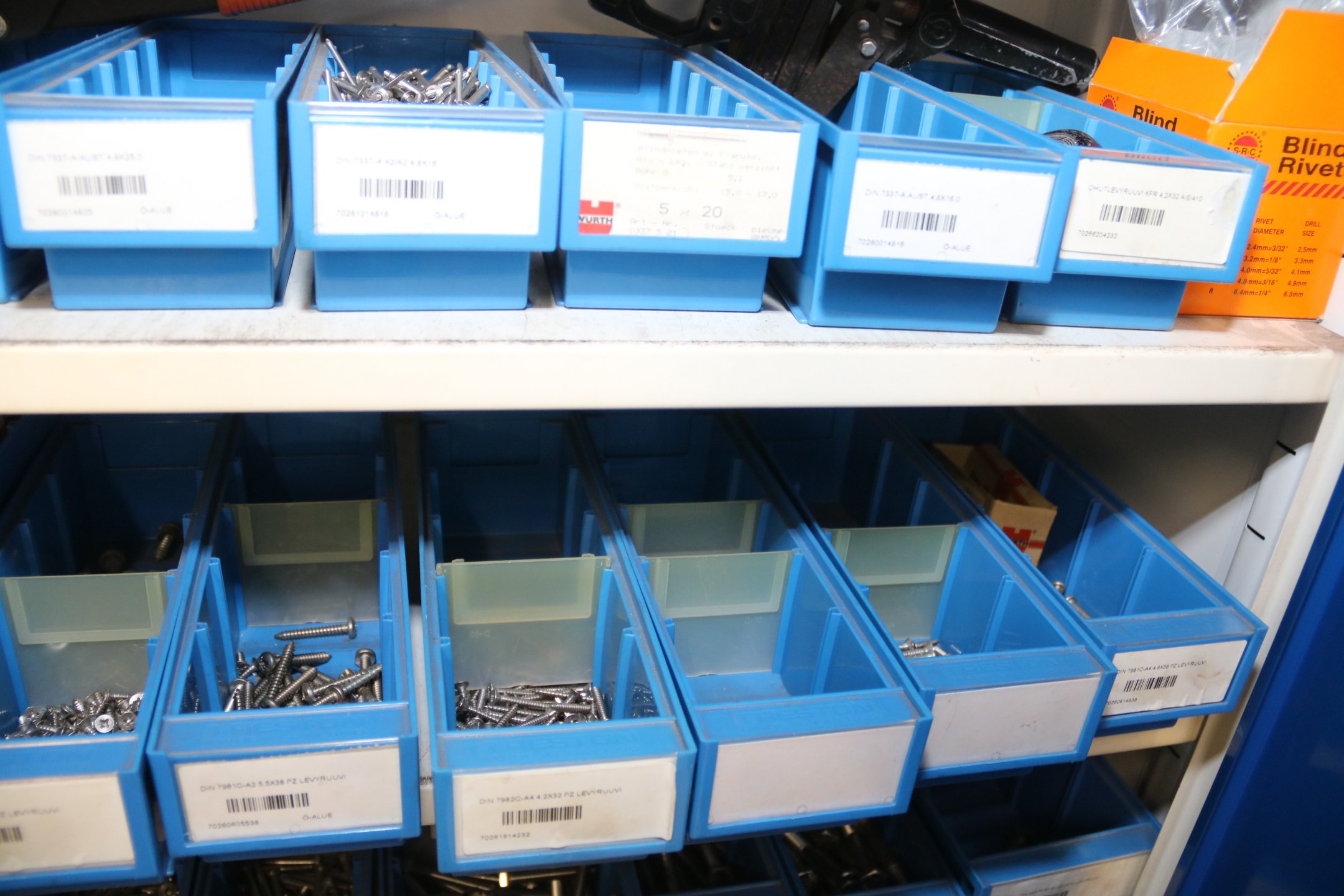 Peltikaappi jossa suurin osa ruostumattomia pultteja, ruuveja y.m.