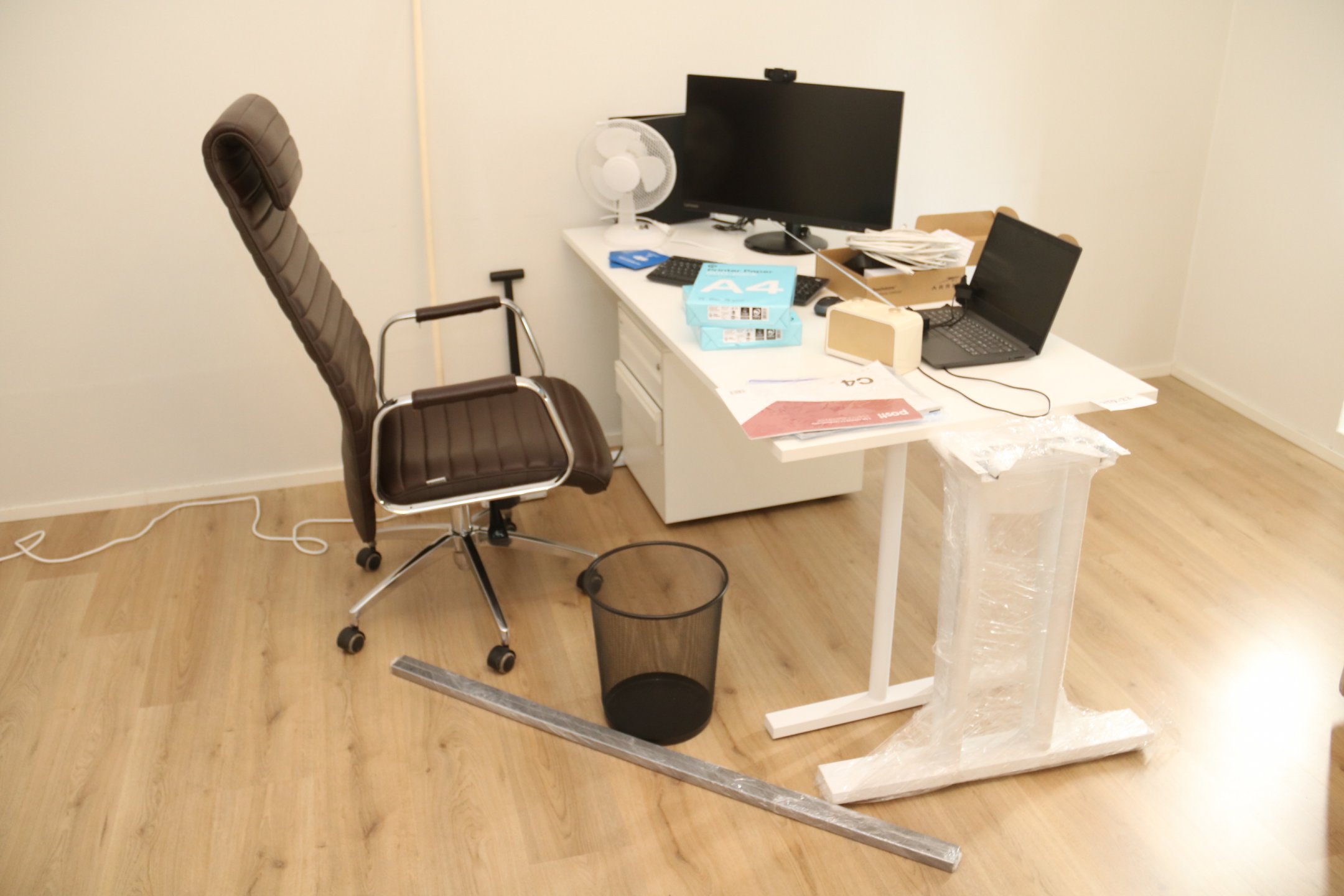 Kirjoituspöytä, toimistotuoli, kannettava tietokone y.m.