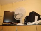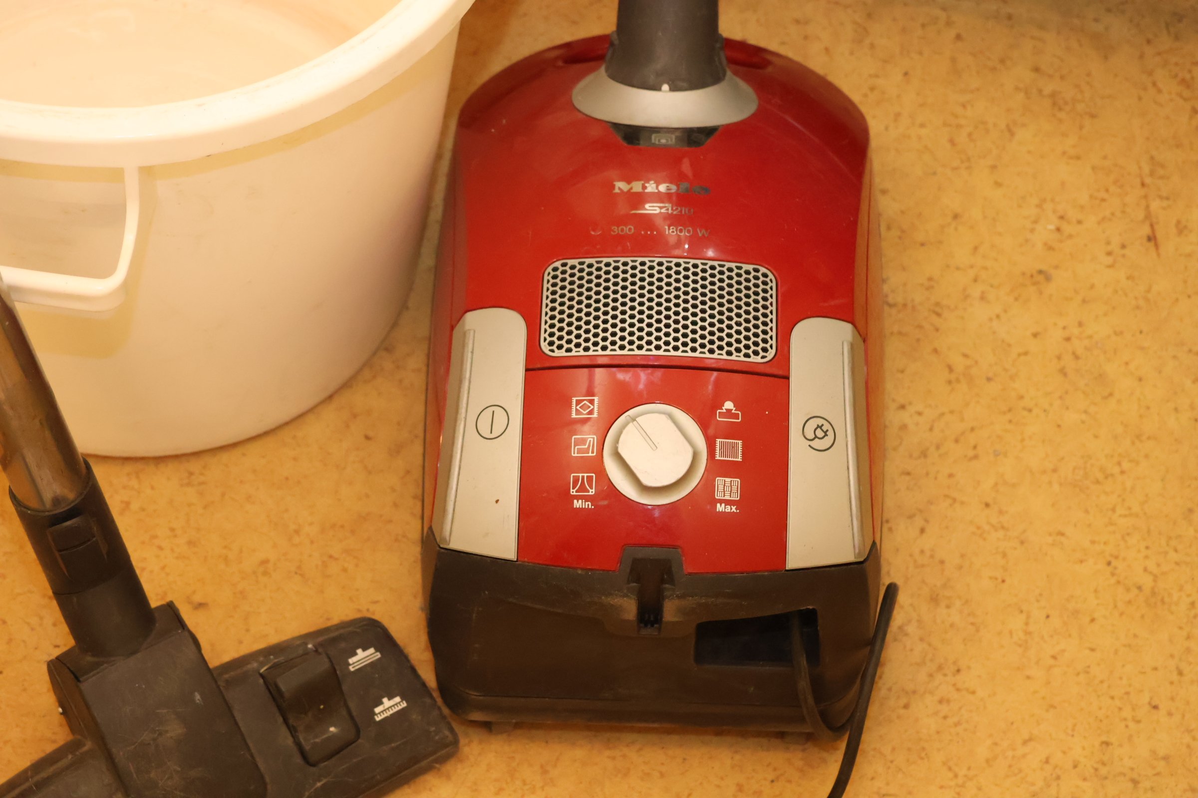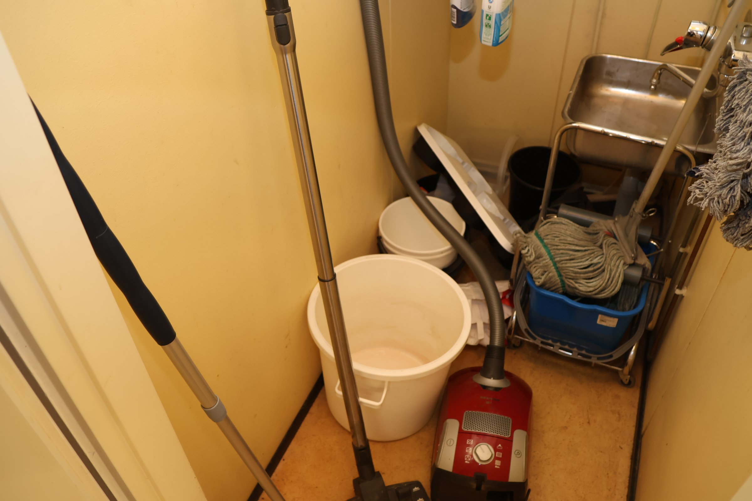 Kassakone, siivoustarvikkeita y.m.