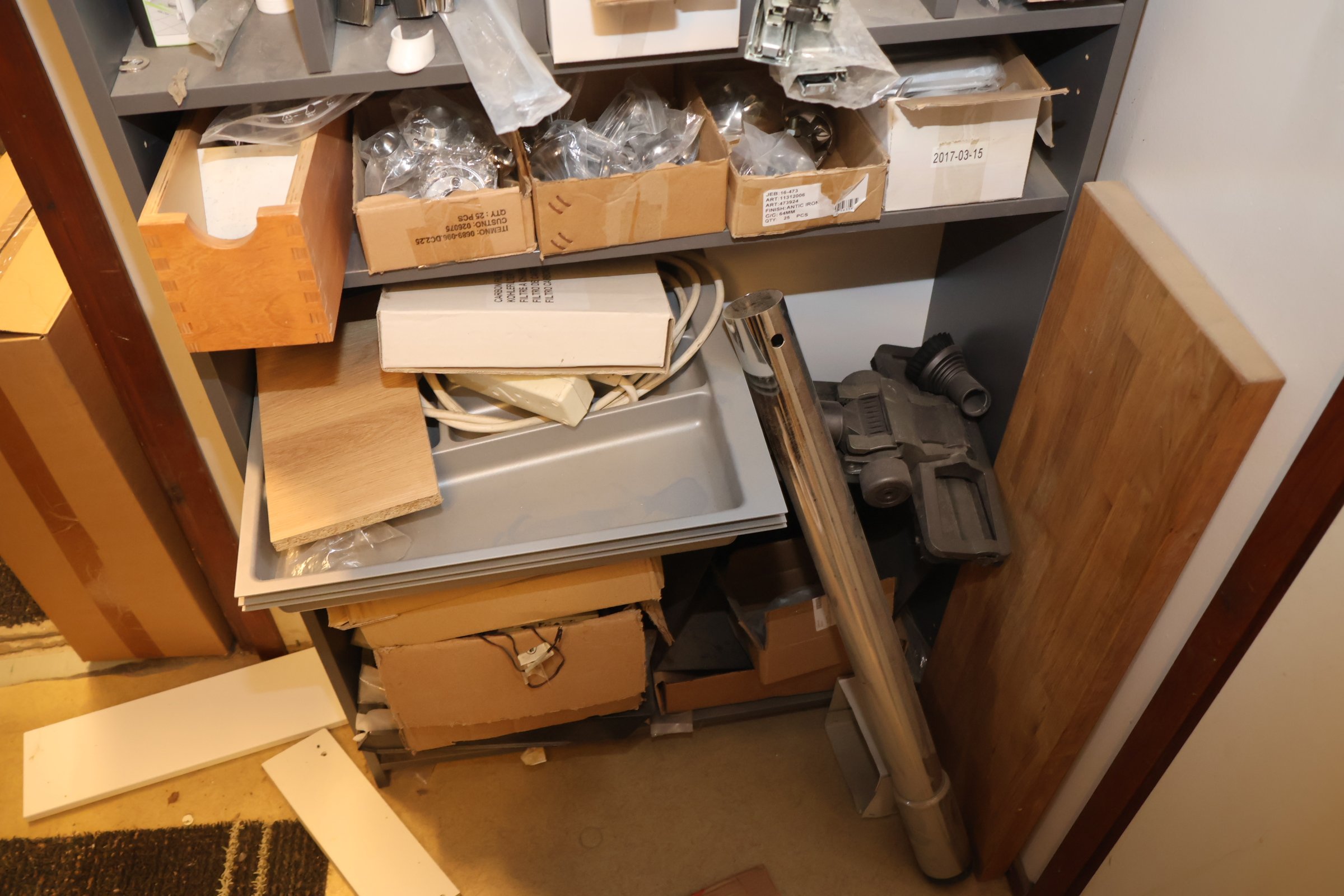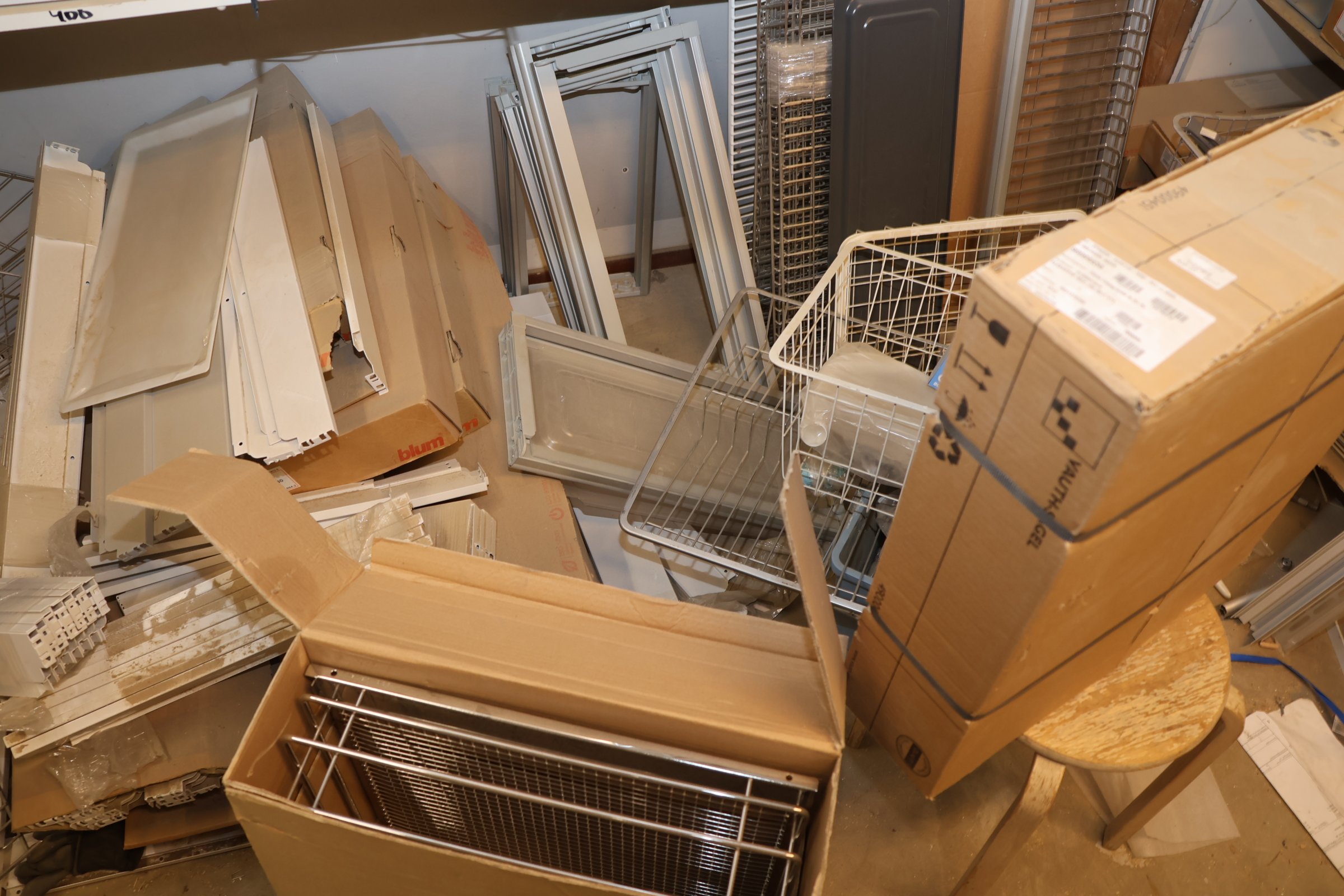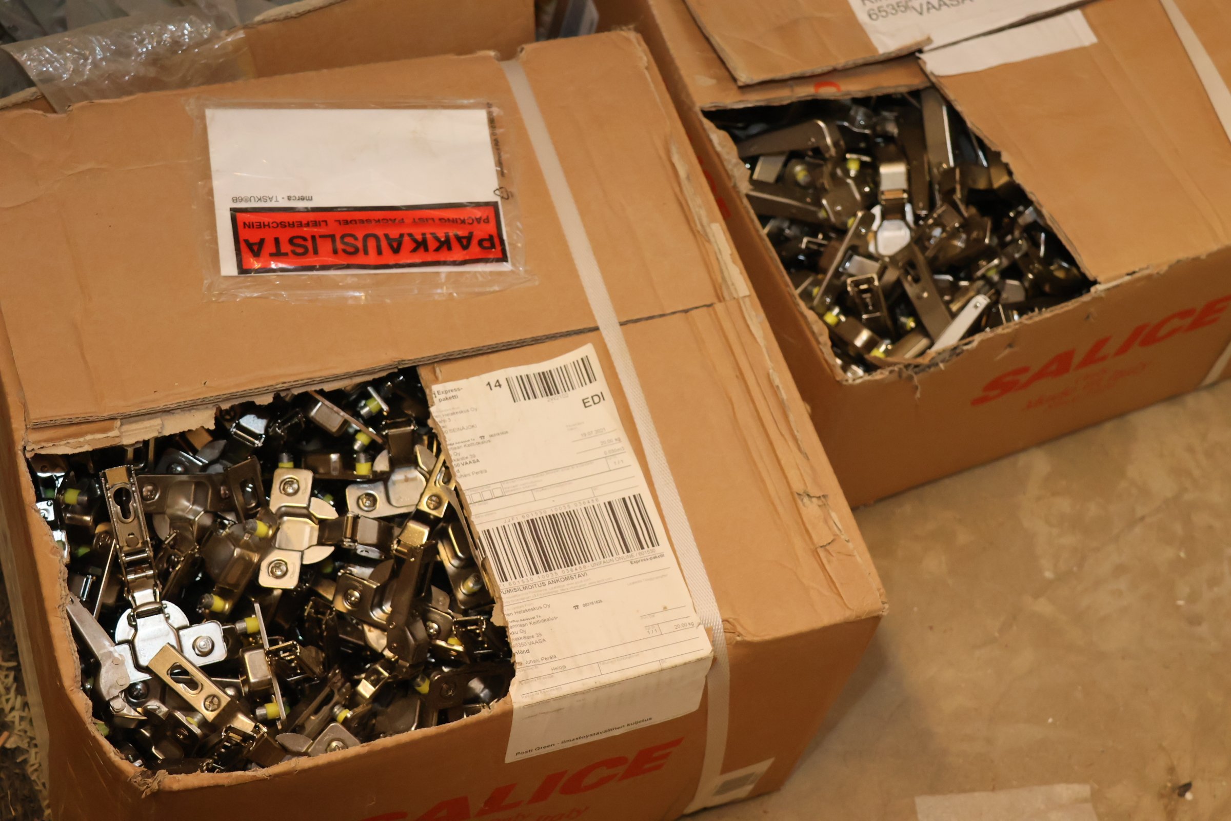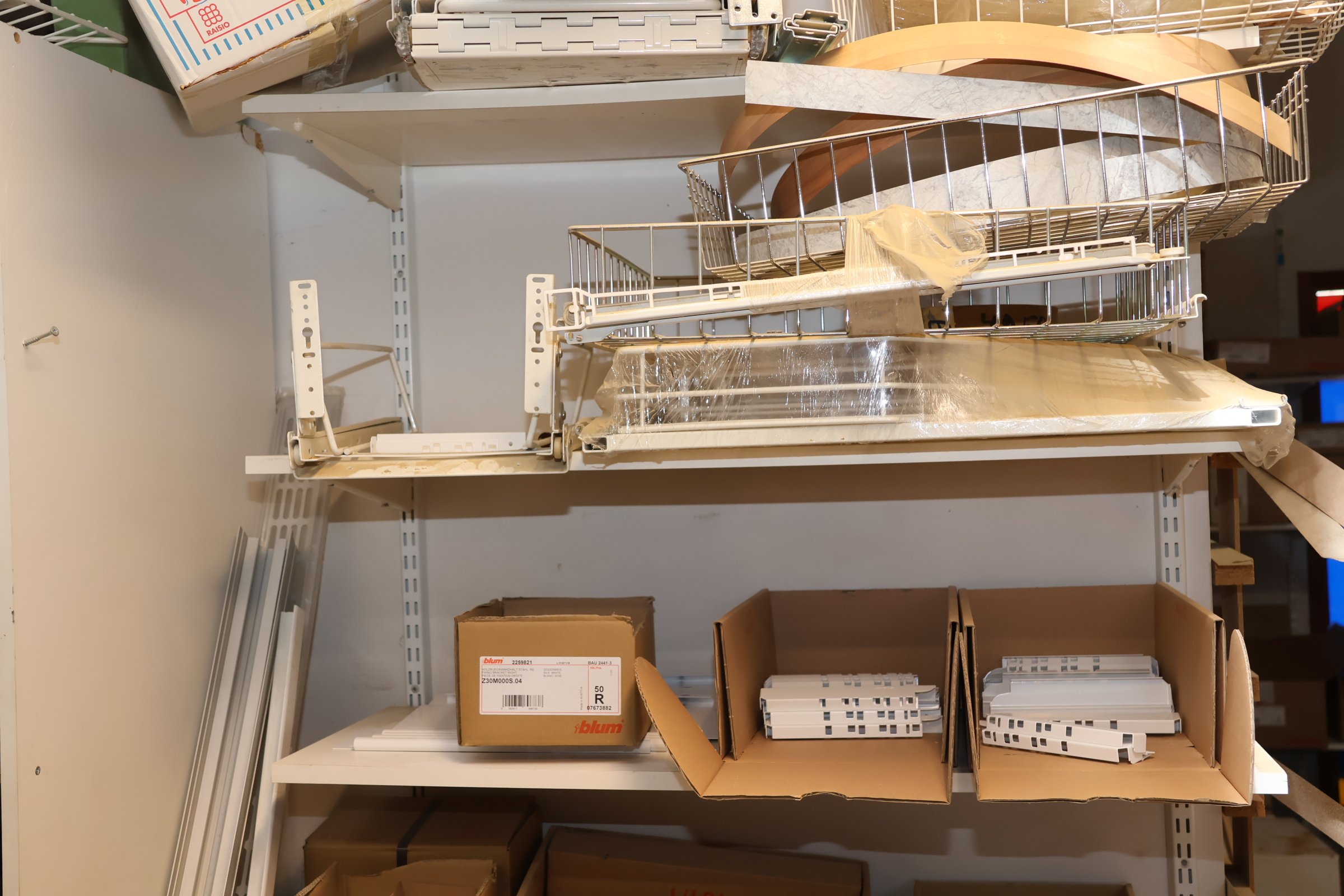 Keittiökaappien saranoita, kiskoja, laatikoita, tarvikkeita y.m.