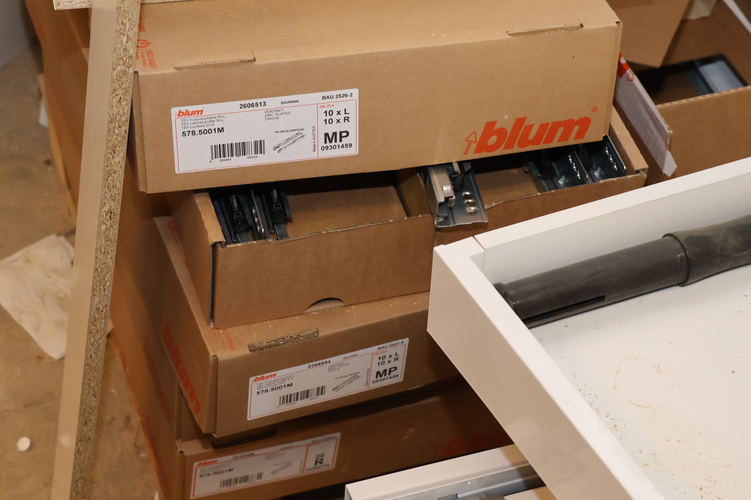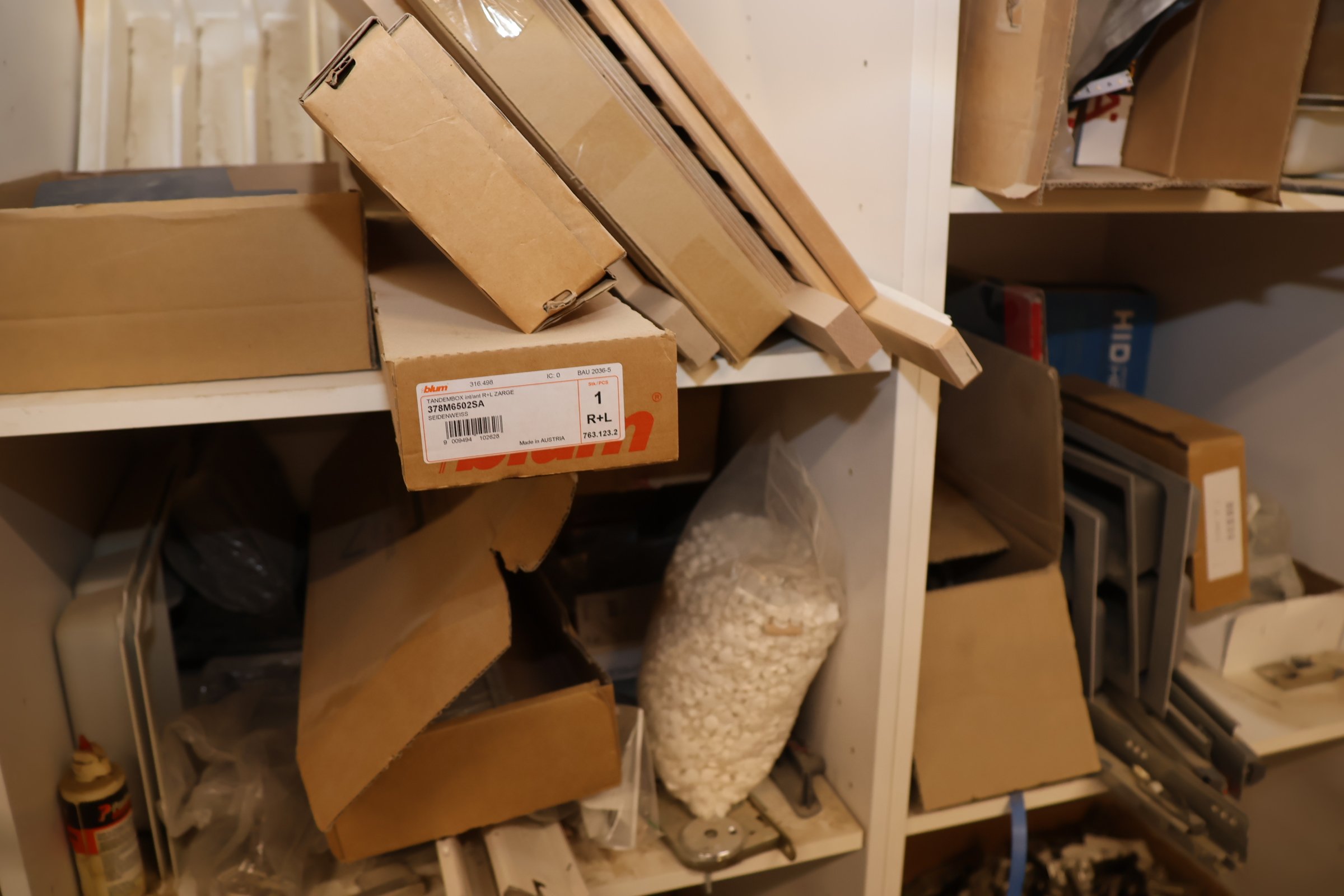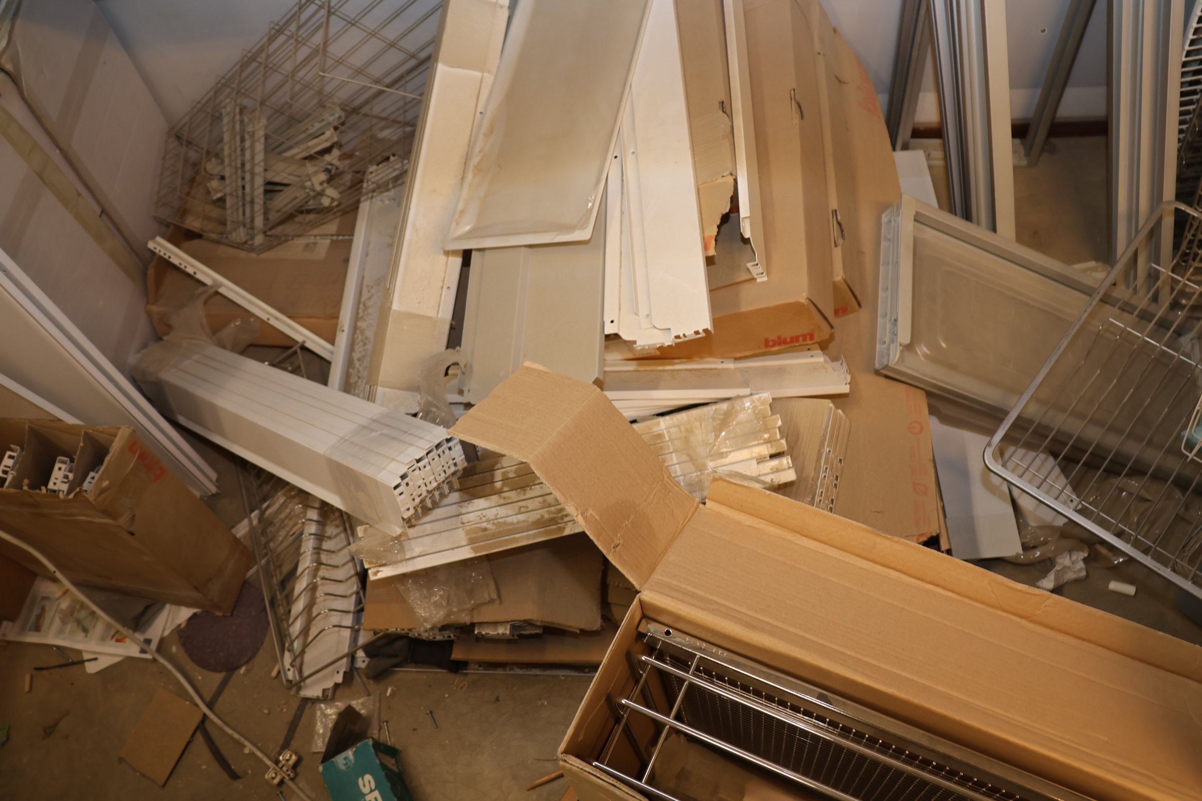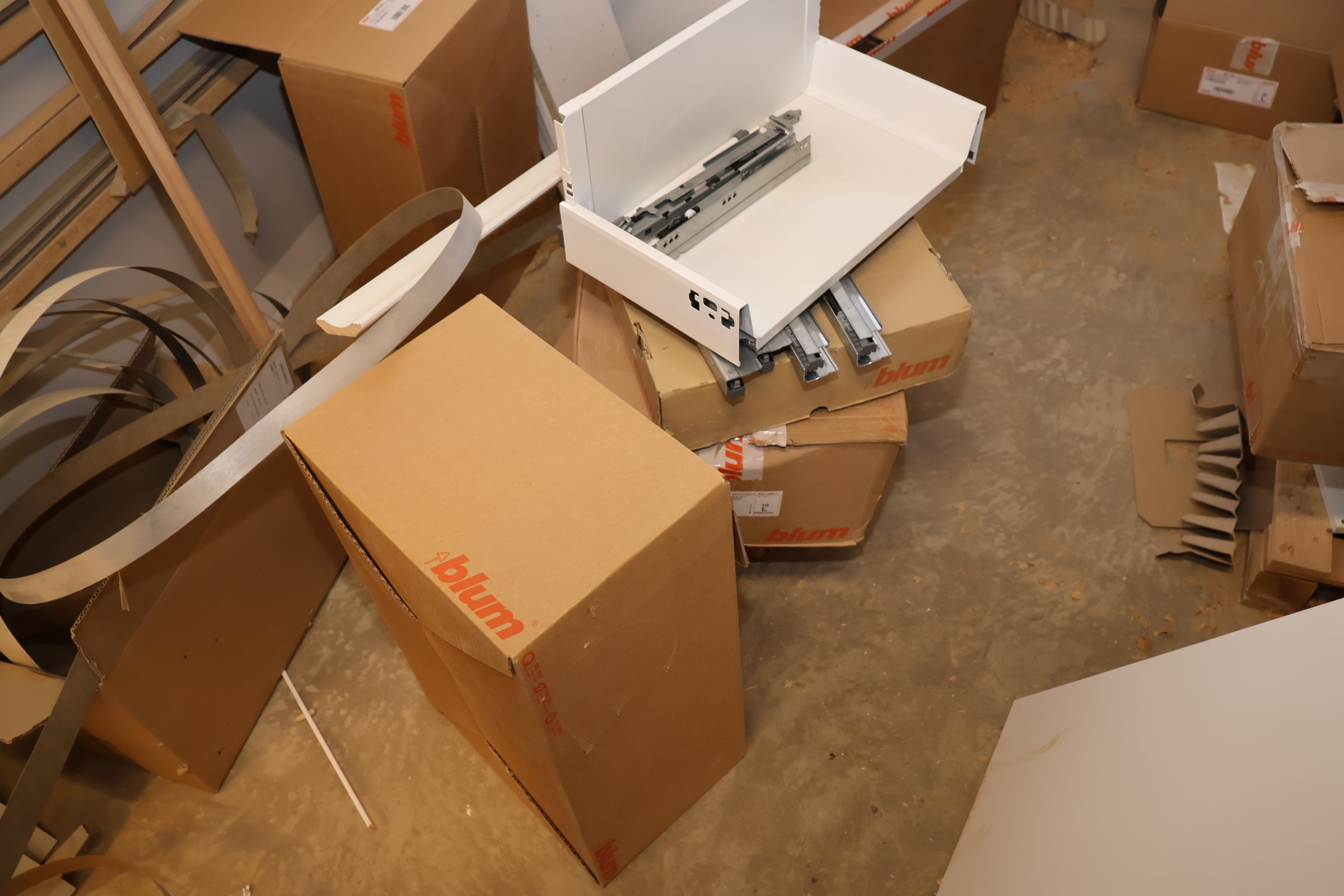 Keittiökaappien saranoita, kiskoja, laatikoita, tarvikkeita y.m.