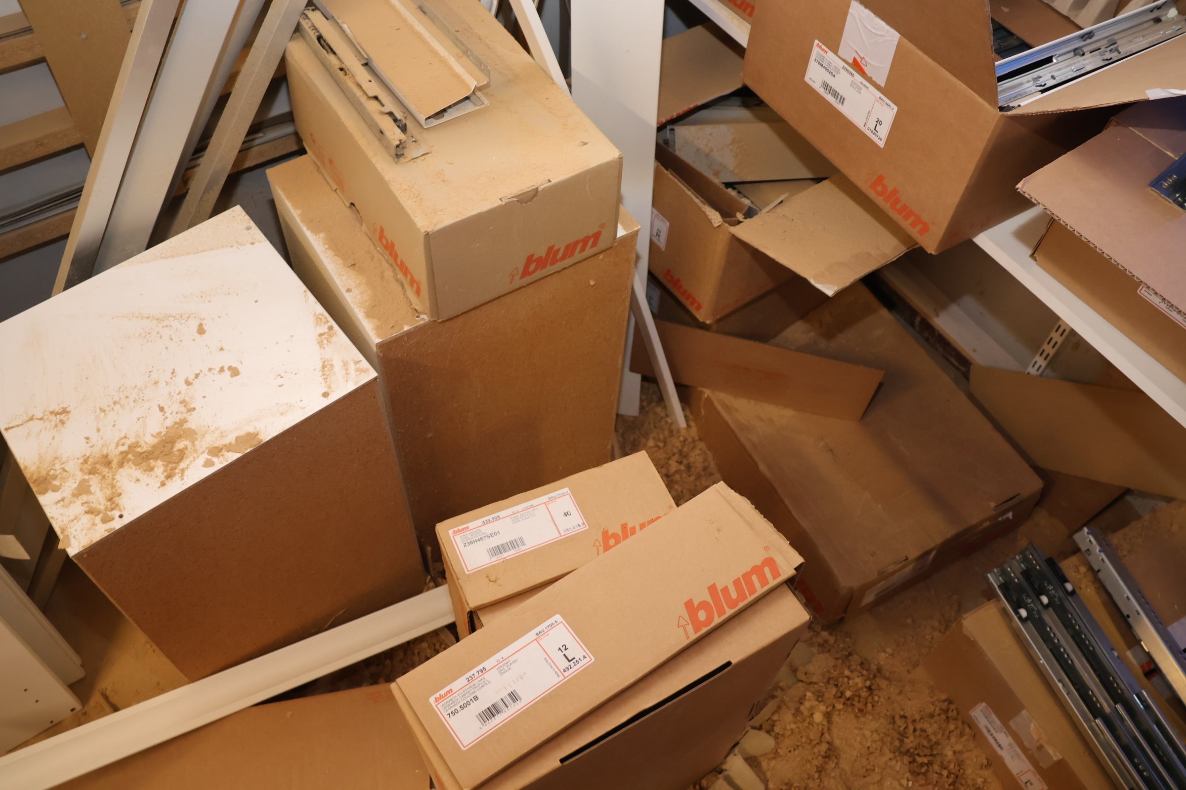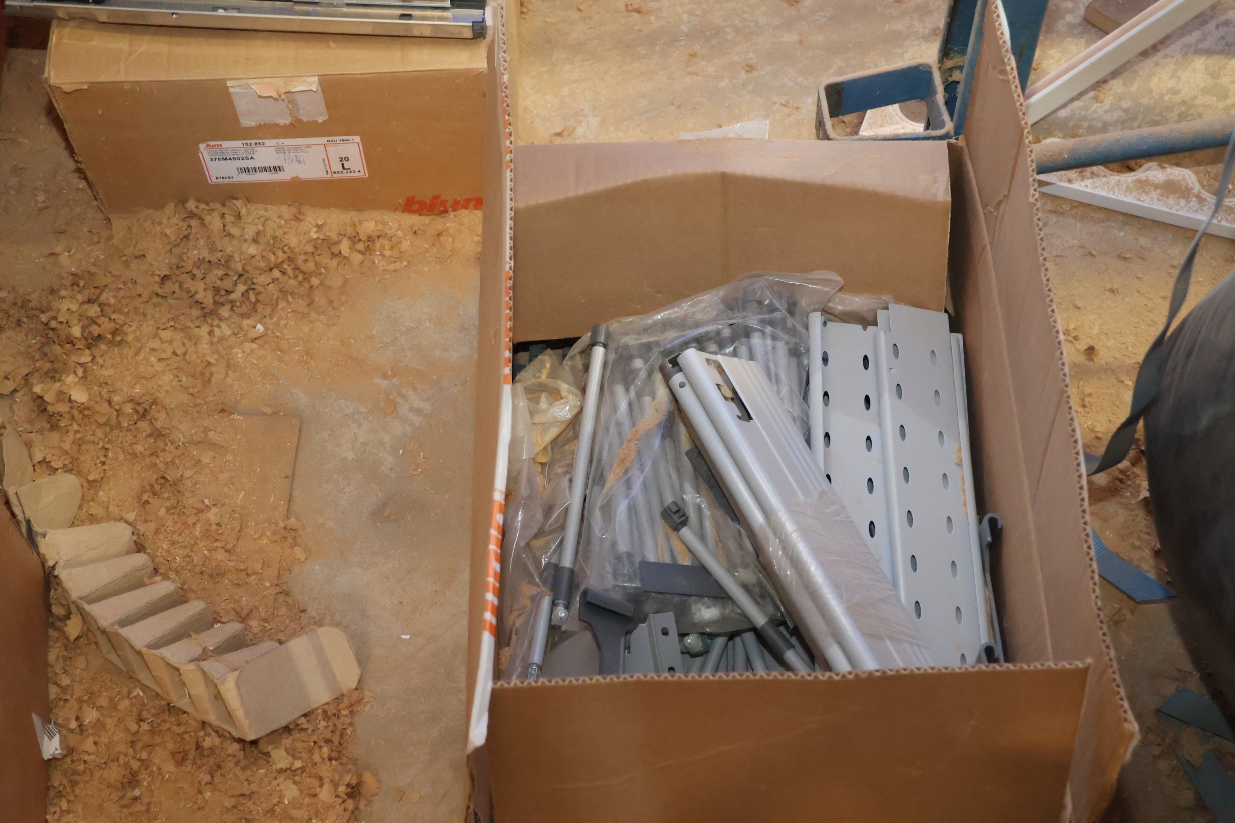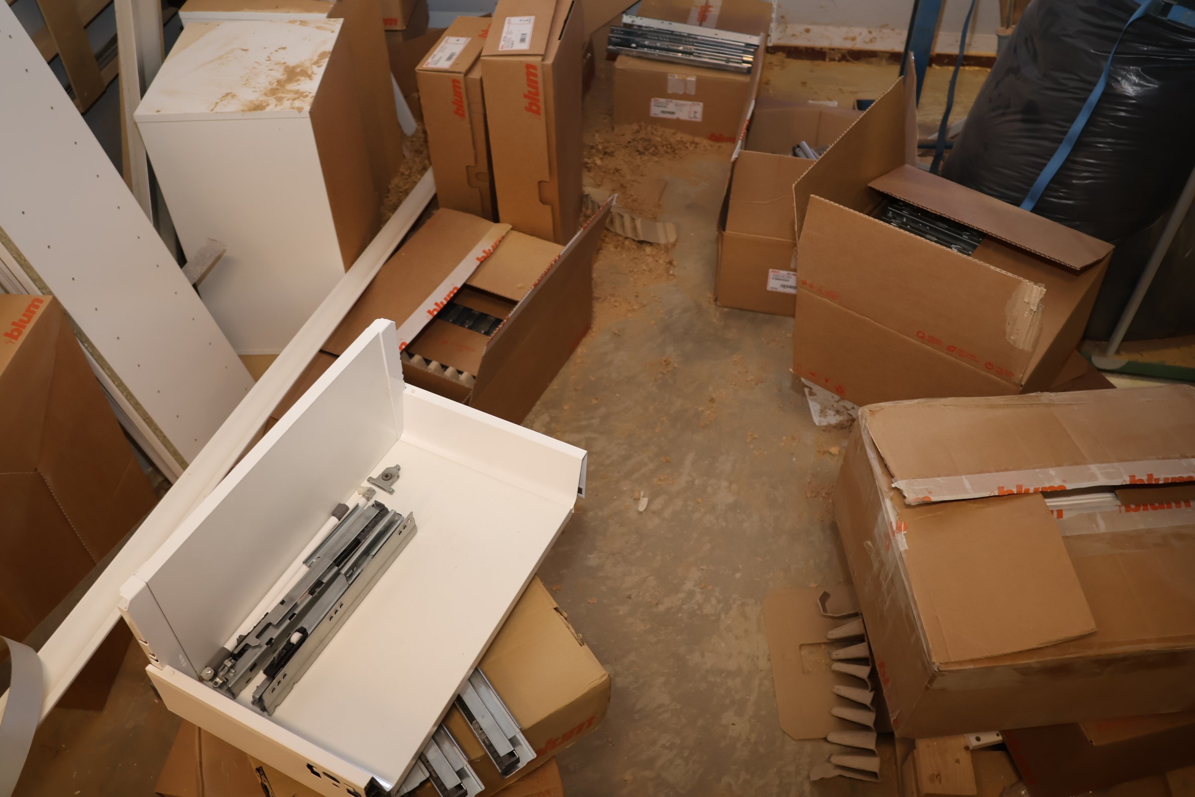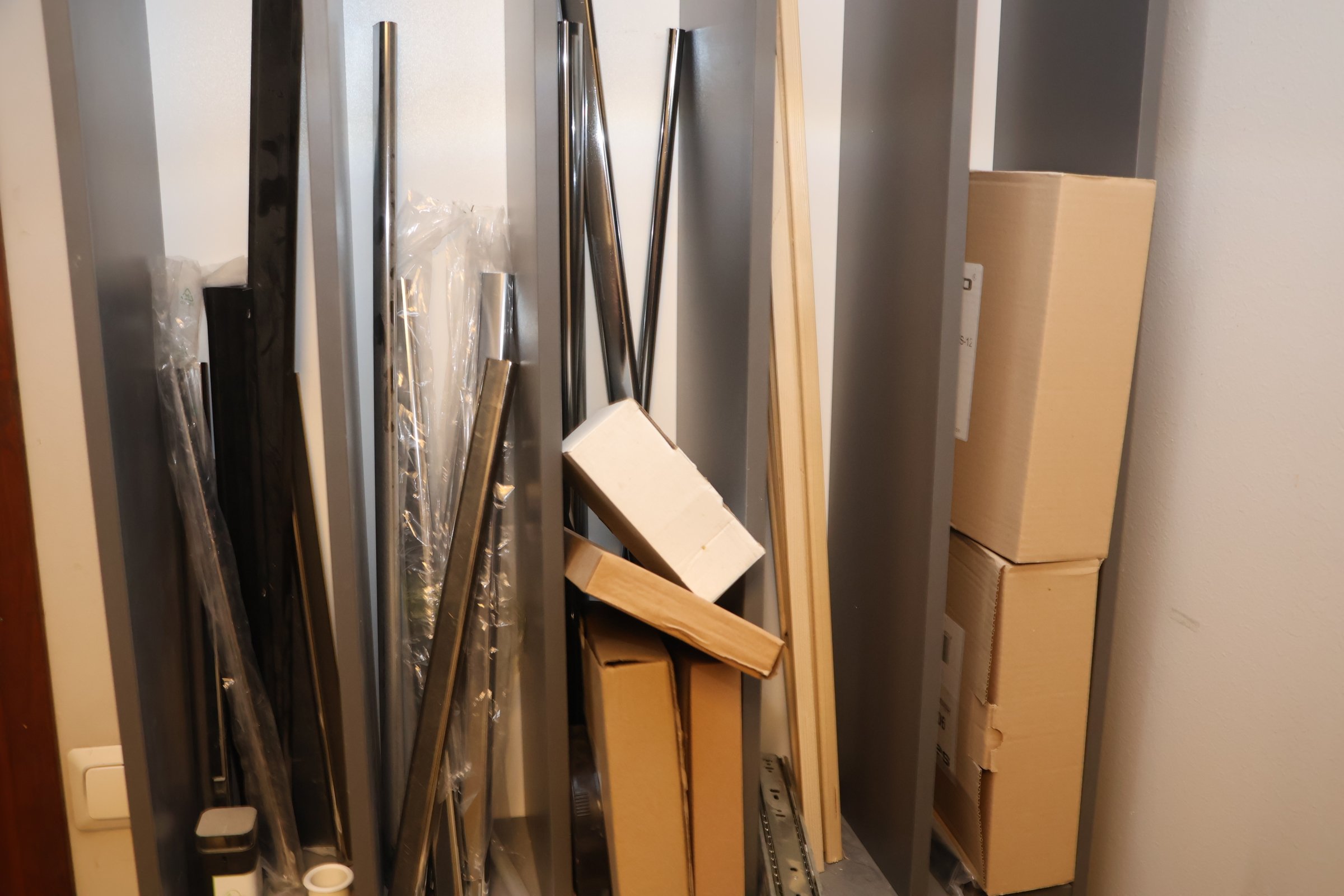 Keittiökaappien saranoita, kiskoja, laatikoita, tarvikkeita y.m.
